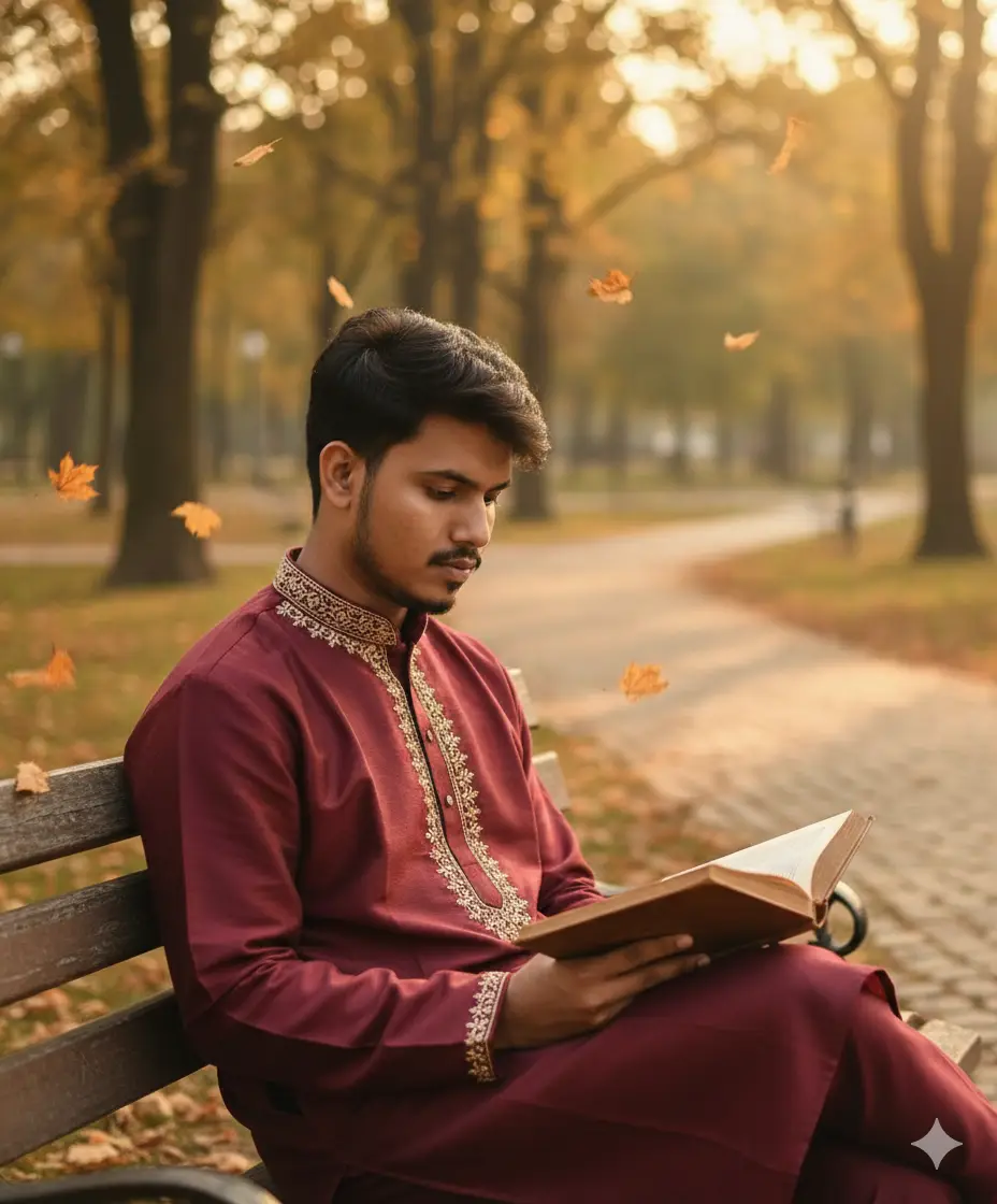 A handsome young man sitting gracefully on a wooden park bench, wearing a traditional maroon panjabi with delicate embroidery. He is holding and reading an old book with full focus, exuding elegance, wisdom, and calmness. His neatly styled hair carries a soft, natural look, adding a subtle poetic charm. Autumn leaves gently float in the air around him, creating a dreamy and cinematic atmosphere. The background shows a soft, blurred park with tall trees and a walkway, golden-hour lighting casting a warm, peaceful, and artistic mood. Ultra-realistic, 8K, cinematic portrait style.