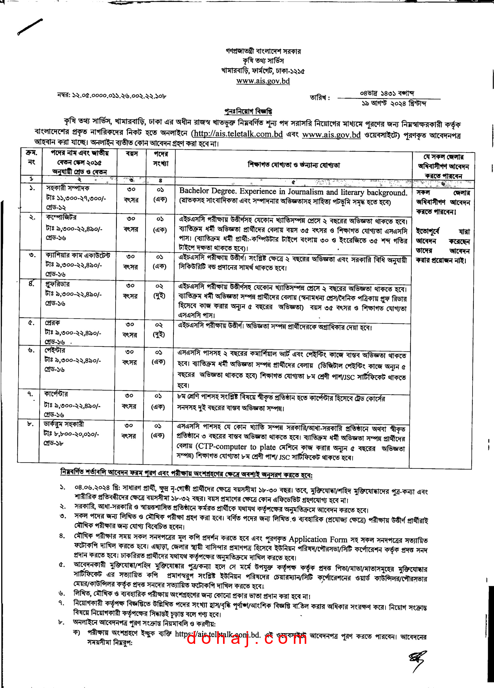 কৃষি তথ্য সার্ভিস শূন্য পদসমূহে জনবল নিয়োগের বিজ্ঞপ্তি প্রকাশ করেছে। কৃষি তথ্য সার্ভিস ০৮টি পদে মোট ১০ জনকে নিয়োগ দেবে। নারী ও পুরুষ উভয়কেই নিয়োগ দেওয়া হবে। আগ্রহী প্রার্থীরা অনলাইনে আবেদন করতে পারবেন। এই চাকরিতে সকল জেলার প্রার্থীরা আবেদন করতে পারবেন। আগ্রহ ও যোগ্যতা থাকলে আপনিও আবেদন করতে পারেন। সম্পূর্ণ বিজ্ঞপ্তি বিস্তারিত দেওয়া হল।