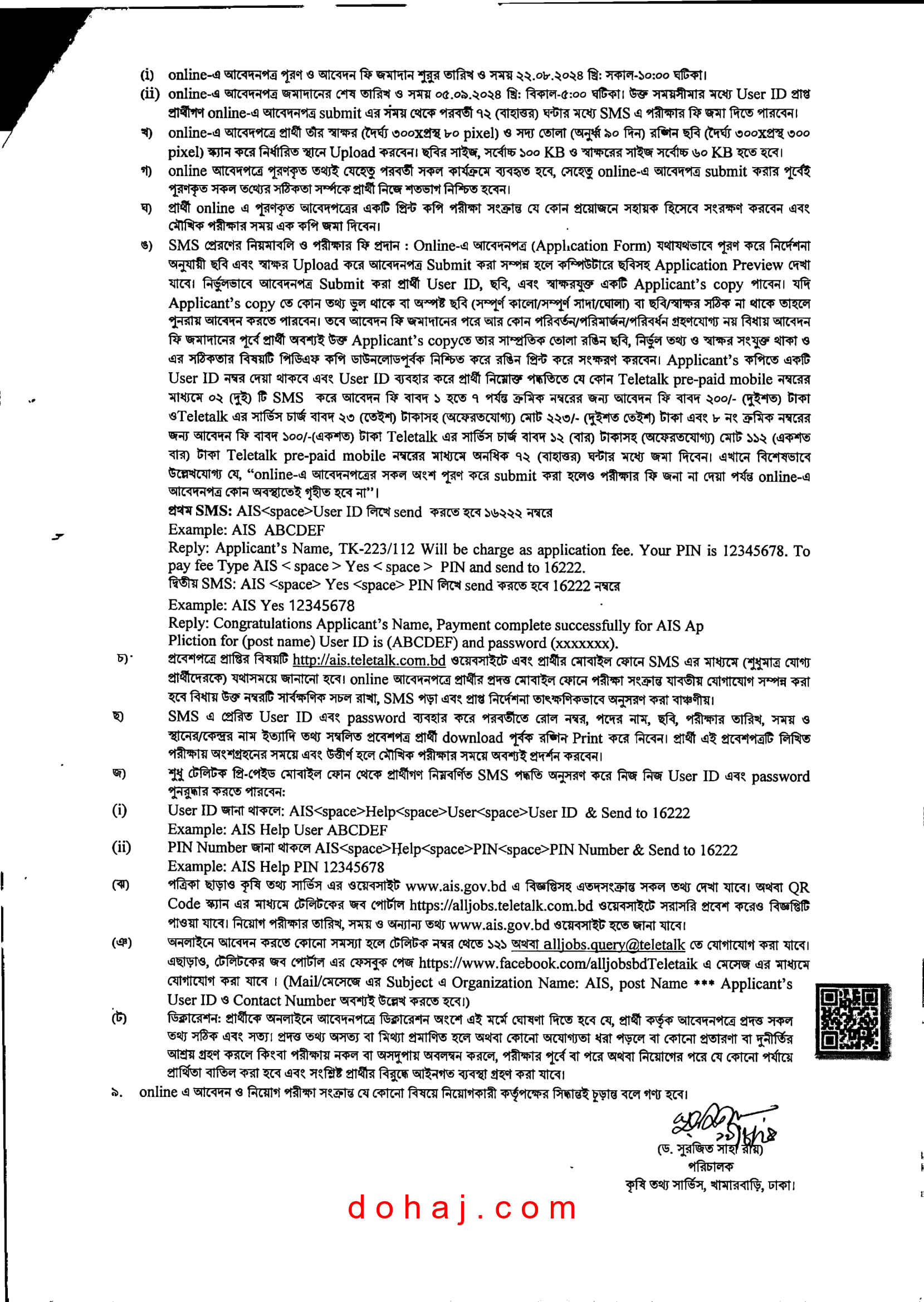 আবেদন প্রক্রিয়া: আগ্রহী প্রার্থীরা অনলাইনে http://ais.teletalk.com.bd এই ওয়েবসাইটে গিয়ে আবেদনপত্র পূরণ করতে পারবেন।