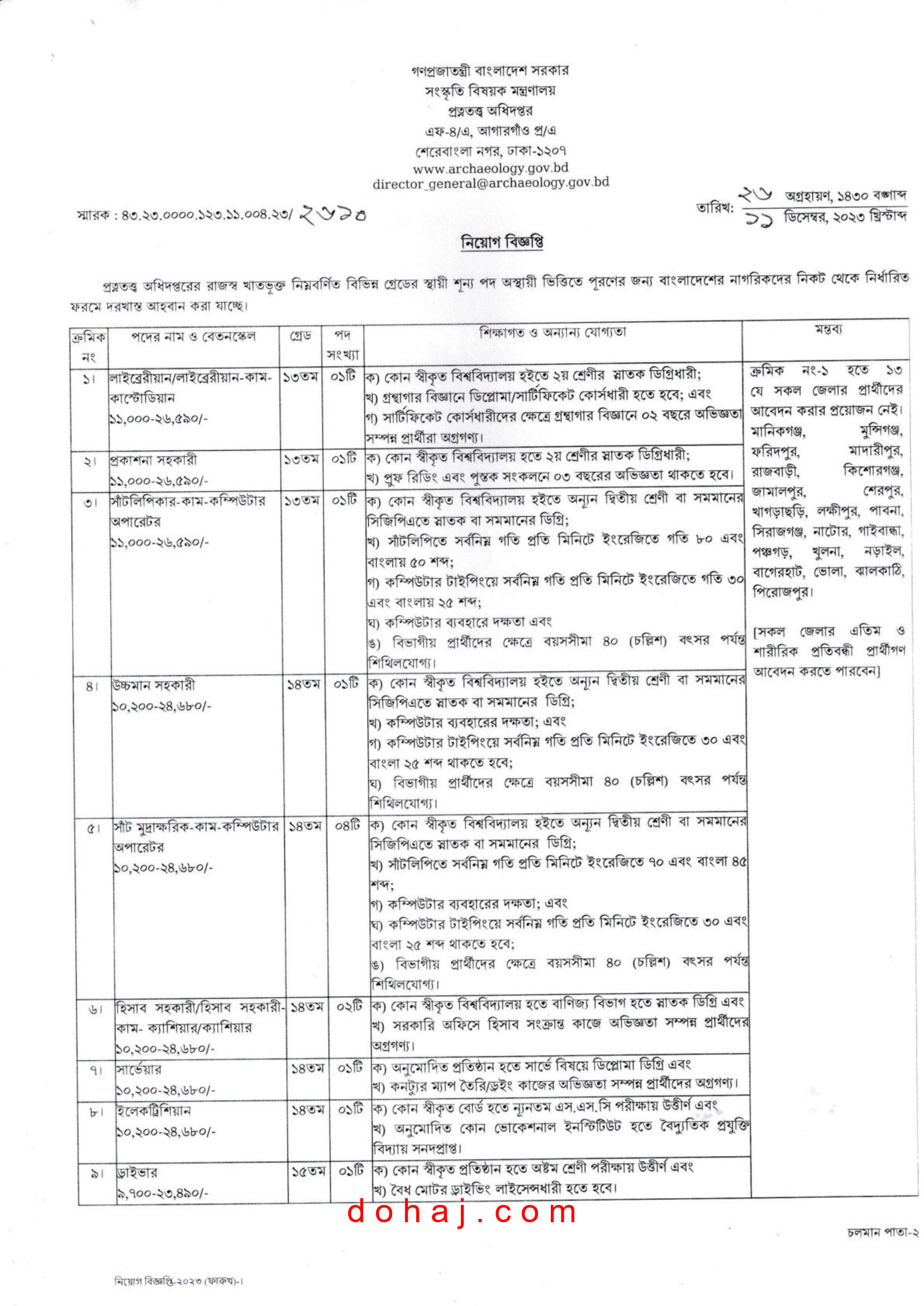 প্রত্নতত্ত্ব অধিদপ্তর স্থায়ী শূন্যপদ গুলোতে জনবল নিয়োগের জন্য নিয়োগ বিজ্ঞপ্তি প্রকাশ করেছে। প্রত্নতত্ত্ব অধিদপ্তর ১৮ টি পদে মোট ৪৮ জনকে নিয়োগ দেবে। পদগুলোতে নারী ও পুরুষ উভয়েই আবেদন করতে পারবেন। আগ্রহ ও যোগ্যতা থাকলে আপনিও আবেদন করতে পারেন। আগ্রহী প্রার্থীরা আগামী ০৬ জানুয়ারি ২০২৪ তারিখ পর্যন্ত অনলাইনে আবেদন করতে পারবেন। সম্পূর্ণ বিজ্ঞপ্তি বিস্তারিত দেওয়া হল।