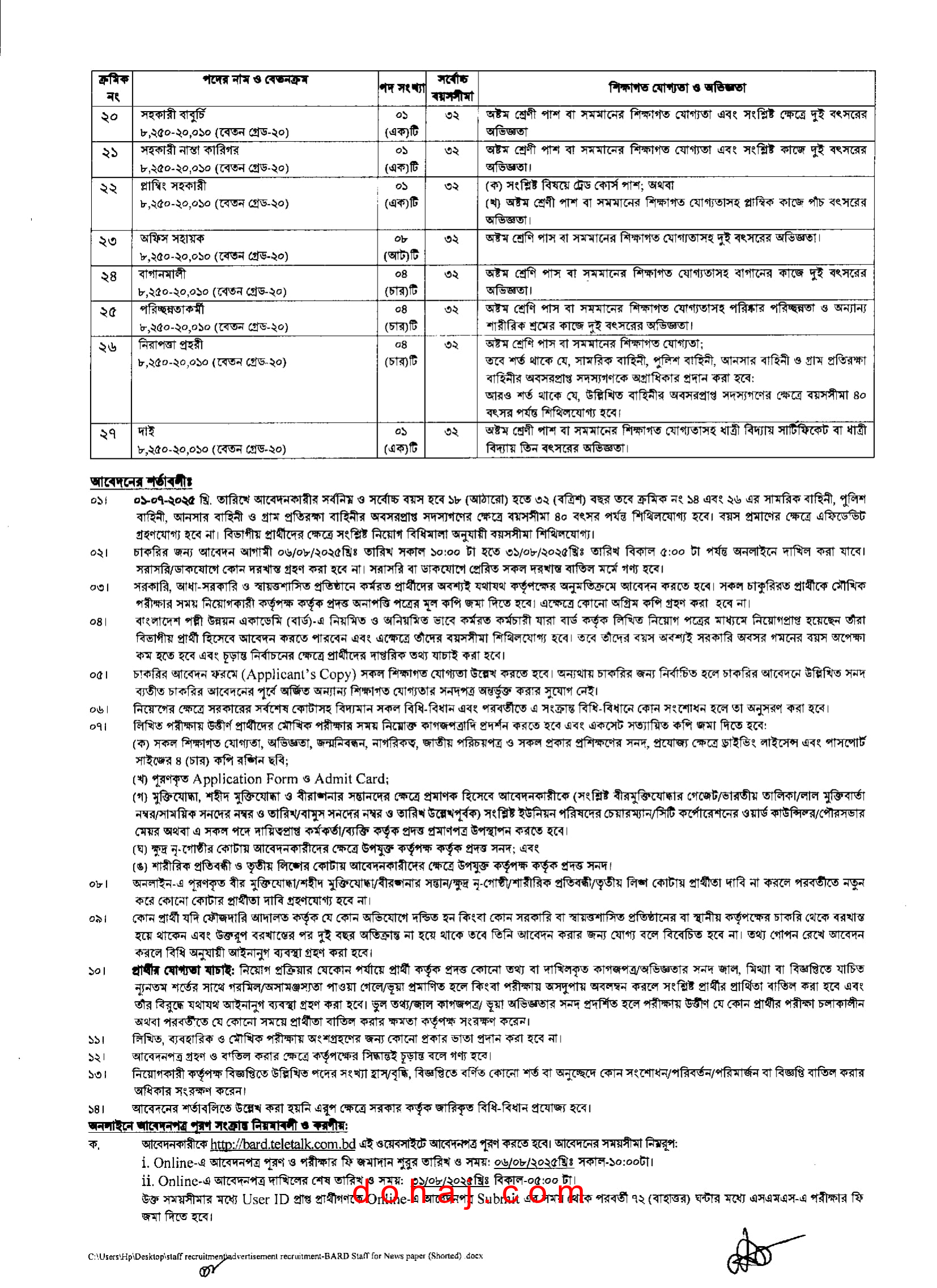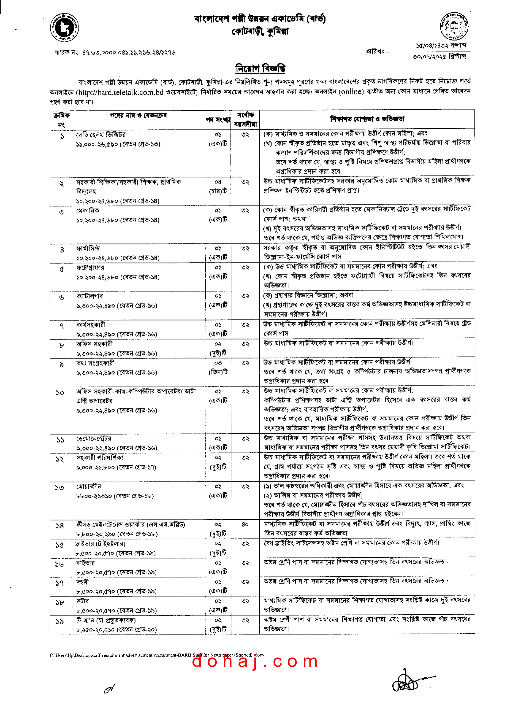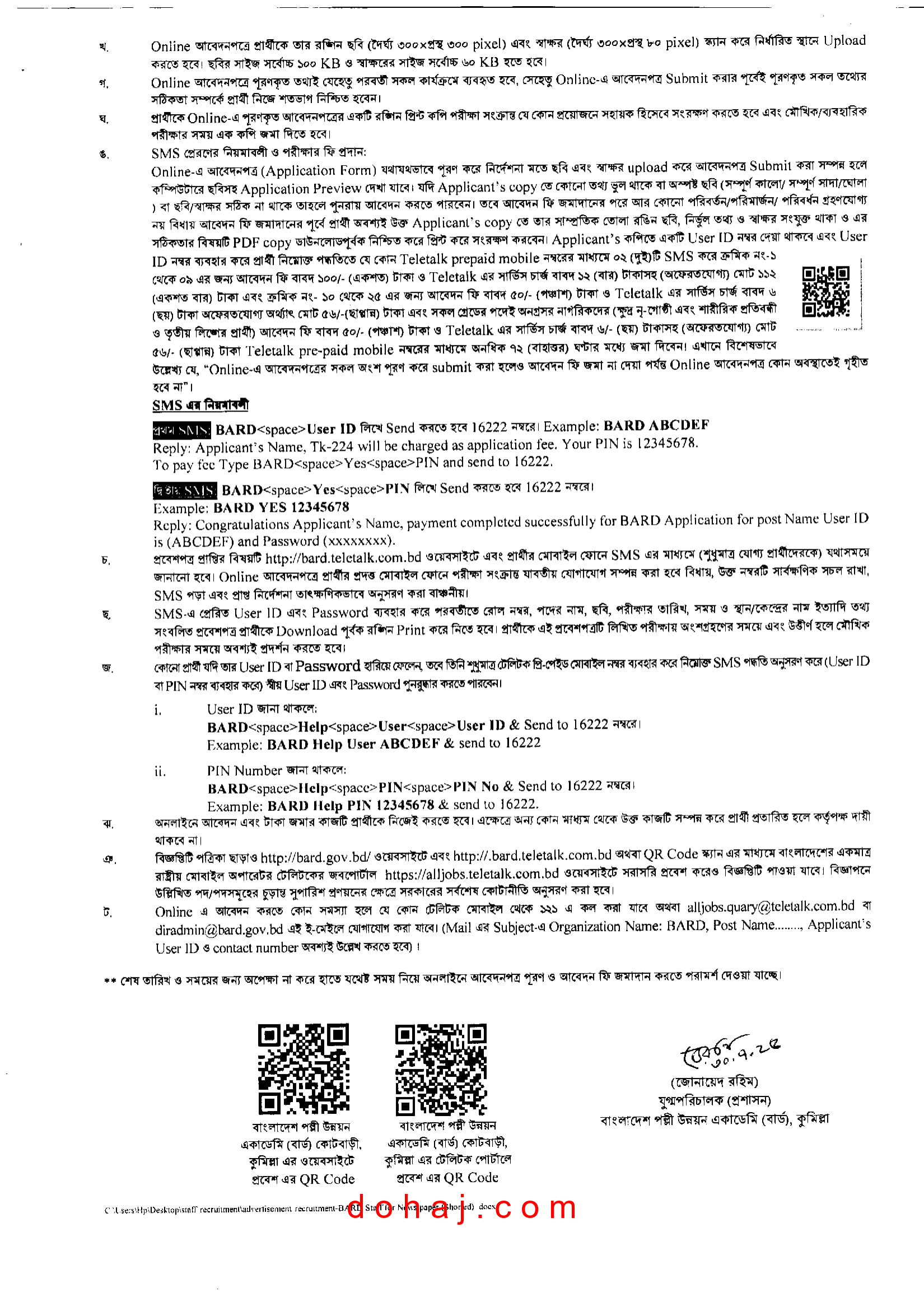 | আবেদন করার পদ্ধতি/ধরনজব সার্কুলার | অনলাইনে http://bard.teletalk.com.bd/ ওয়েবসাইটে প্রবেশ করে |