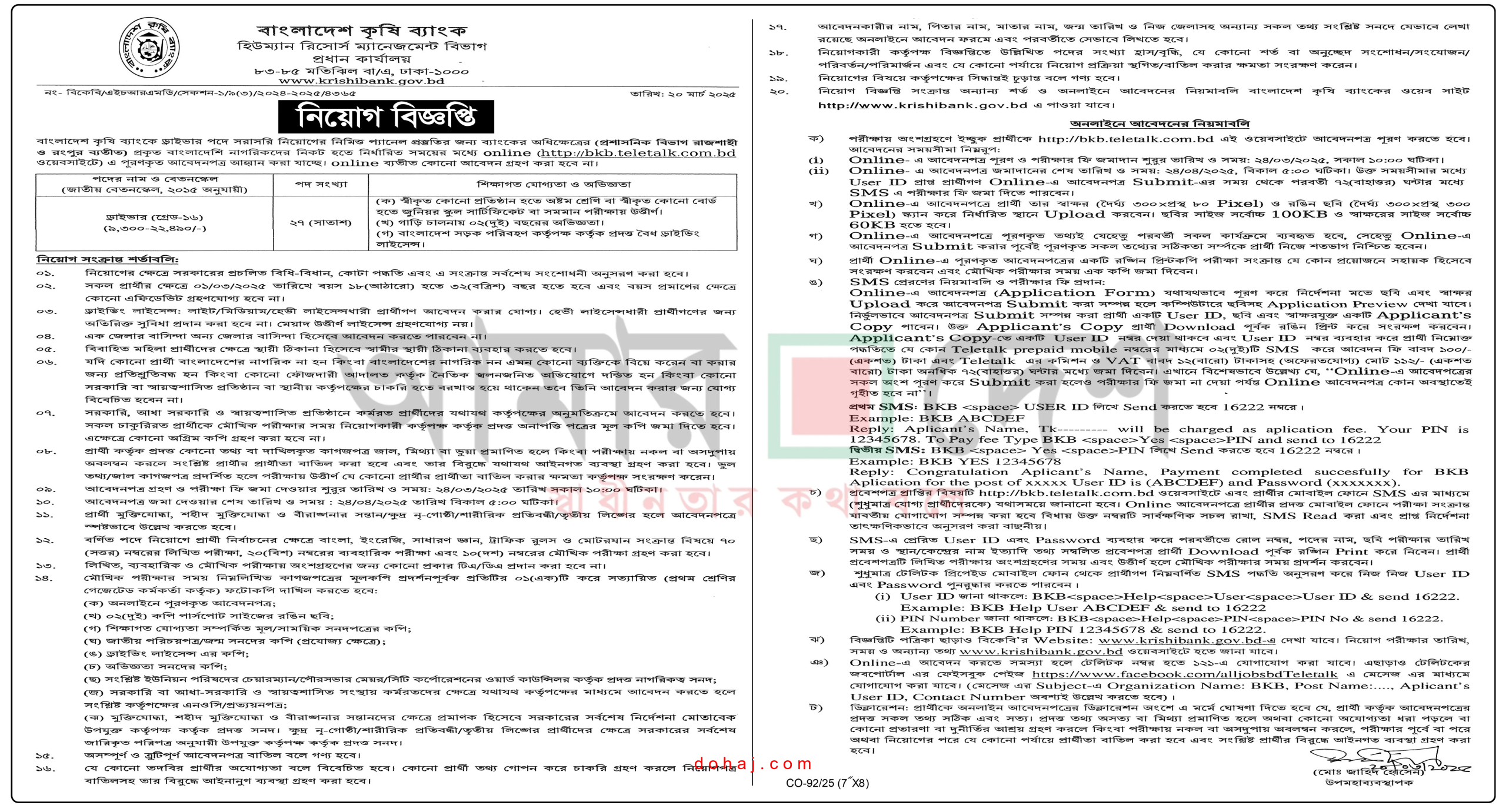 BKB Job Circular 2025: বাংলাদেশ কৃষি ব্যাংক শূন্য পদসমূহে জনবল নিয়োগের বিজ্ঞপ্তি প্রকাশ করেছে। বাংলাদেশ কৃষি ব্যাংক ০১ টি পদে মোট ২৭ জনকে নিয়োগ দেবে। পদ গুলোতে নারী-পুরুষ উভয়েই আবেদন করতে পারবেন। আগ্রহী প্রার্থীরা অনলাইনে আবেদন করতে পারবেন। সম্পূর্ণ বিজ্ঞপ্তি বিস্তারিত দেওয়া হল।