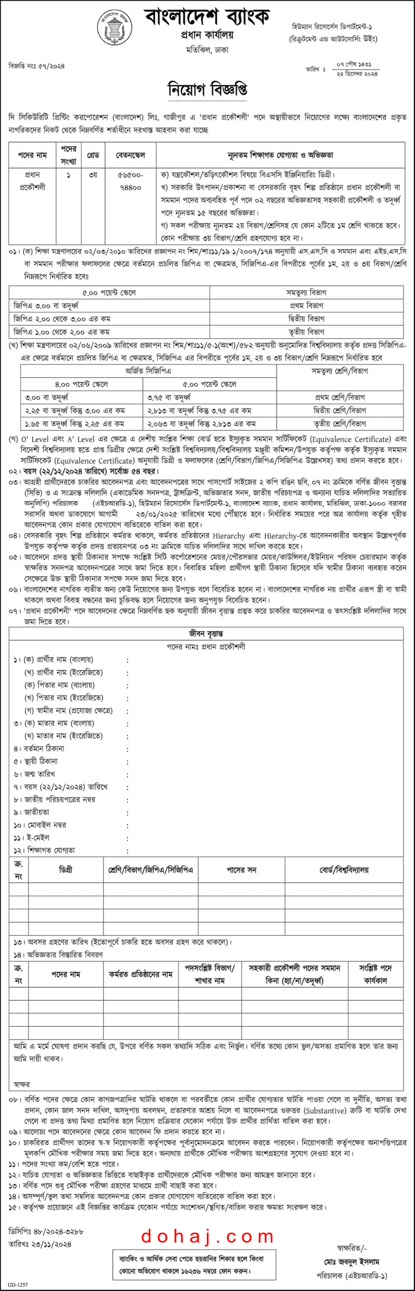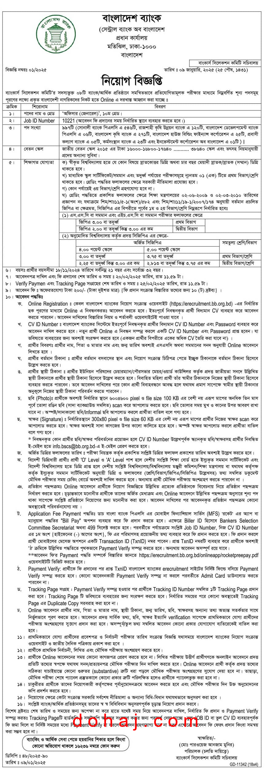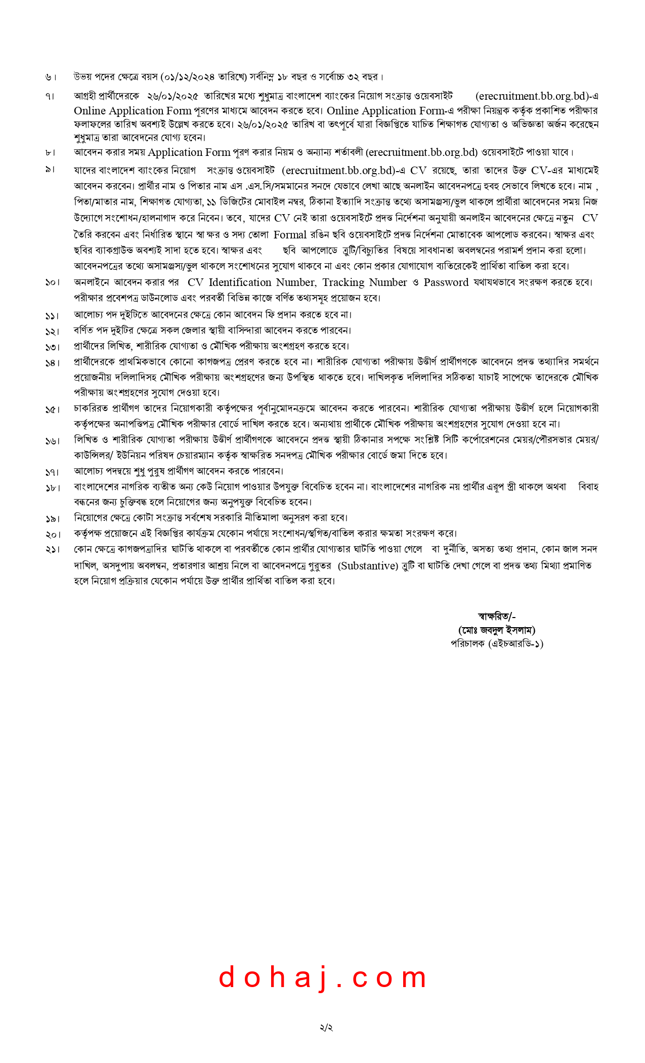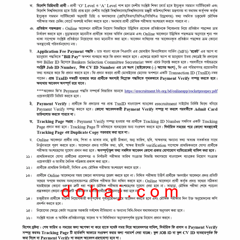 আবেদনের নিয়ম: আগ্রহীরা আবেদনপত্র এবং আবেদনপত্রের সাথে পাসপোর্ট সাইজের ২ কপি রঙিন ছবি, ০৭ নং ক্রমিকে বর্ণিত জীবন বৃত্তান্ত (সিভি) ও এ সংক্রান্ত দলিলাদি (একাডেমিক সনদপত্র, ট্রান্সক্রিপ্ট, অভিজ্ঞতার সনদ, জাতীয় পরিচয়পত্র ও অন্যান্য যাচিত দলিলাদির সত্যায়িত অনুলিপি) পরিচালক (এইচআরডি-১), হিউম্যান রিসোর্সেস ডিপার্টমেন্ট-১, বাংলাদেশ ব্যাংক, প্রধান কার্যালয়, মতিঝিল, ঢাকা-১০০০ বরাবর পৌঁছাতে হবে।
