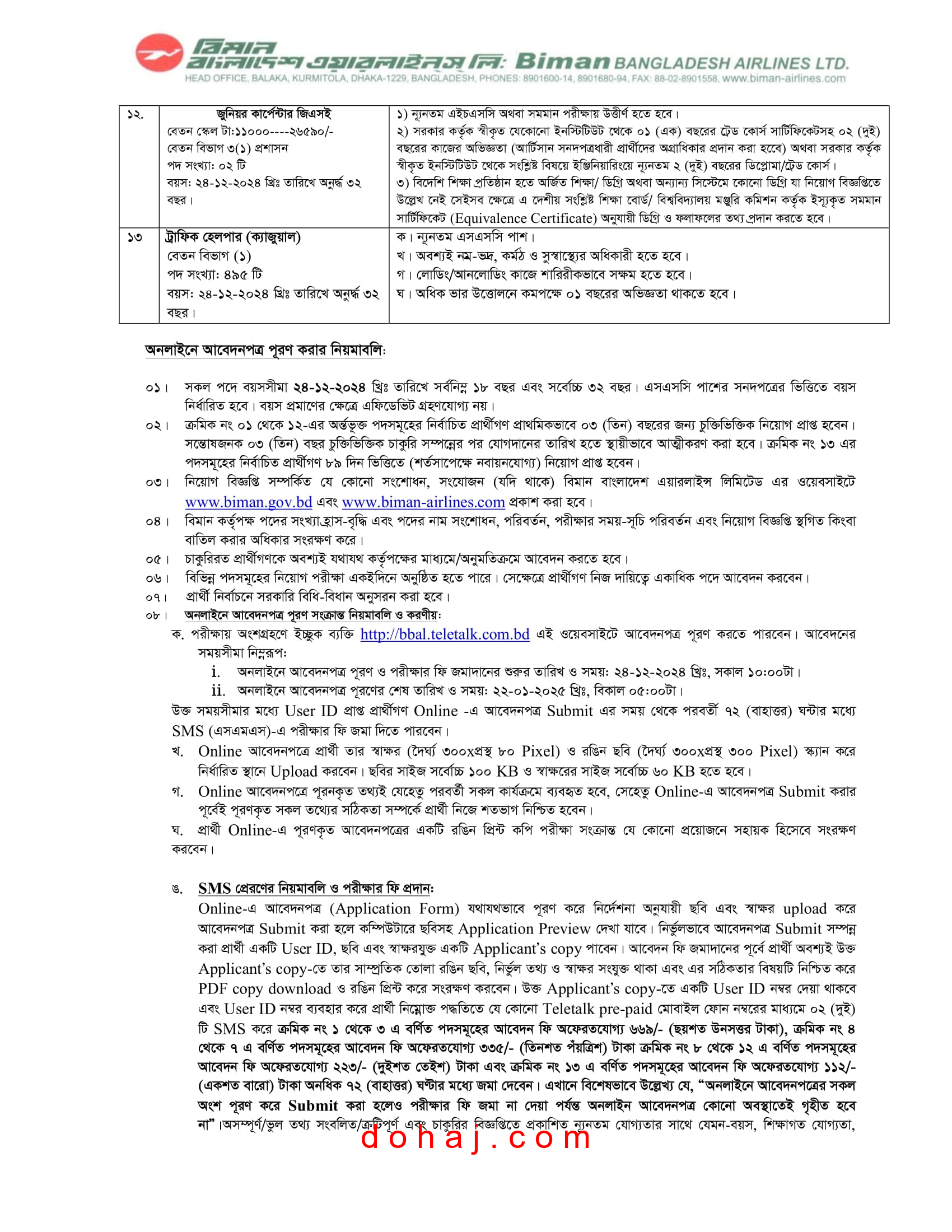 বিমান বাংলাদেশ এয়ারলাইনস লিমিটেড এর শূন্য পদসমূহে জনবল নিয়োগ দেবে। বিমান বাংলাদেশ এয়ারলাইনস লিমিটেড ১ম বিজ্ঞপ্তি অনুসারে ০৬ টি পদে মোট ১২ জনকে এবং ২য় বিজ্ঞপ্তি অনুসারে ০৩ টি পদে মোট ১৫২ জনকে নিয়োগ দেবে। উক্ত পদে নারী-পুরুষ উভয়ই প্রার্থীরা আবেদন করতে পারবেন। আগ্রহী প্রার্থীরা অনলাইনে আবেদন করতে পারবেন। আগ্রহ ও যোগ্যতা থাকলে আপনিও আবেদন করতে পারেন। সম্পূর্ণ বিজ্ঞপ্তি বিস্তারিত দেওয়া হল।