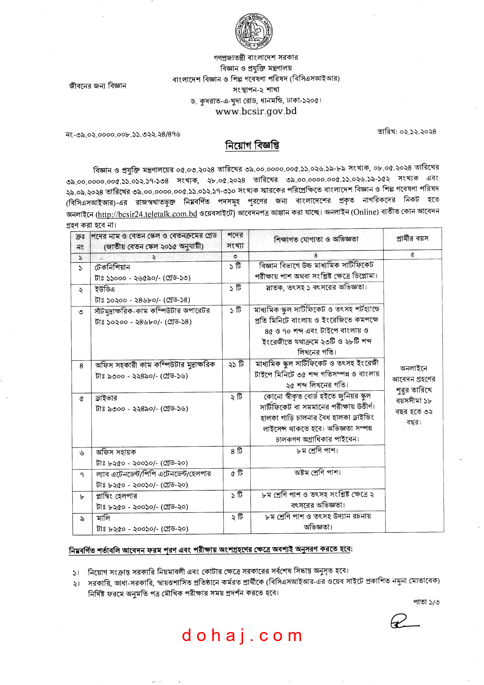 BCSIR job circular 2024: বাংলাদেশ বিজ্ঞান ও শিল্প গবেষণা পরিষদে (বিসিএসআইআর) শূন্য পদসমূহে স্থায়ী ভাবে জনবল নিয়োগের জন্য নিয়োগ বিজ্ঞপ্তি প্রকাশ করেছে। বিসিএসআইআর ৯ টি পদে মোট ৩৮ জনকে নিয়োগ দেবে। পদগুলোতে নারী ও পুরুষ উভয়েই আবেদন করতে পারবেন। আগ্রহী প্রার্থীরা অনলাইনে আবেদন করতে পারবেন। সম্পূর্ণ বিজ্ঞপ্তি বিস্তারিত দেওয়া হল।