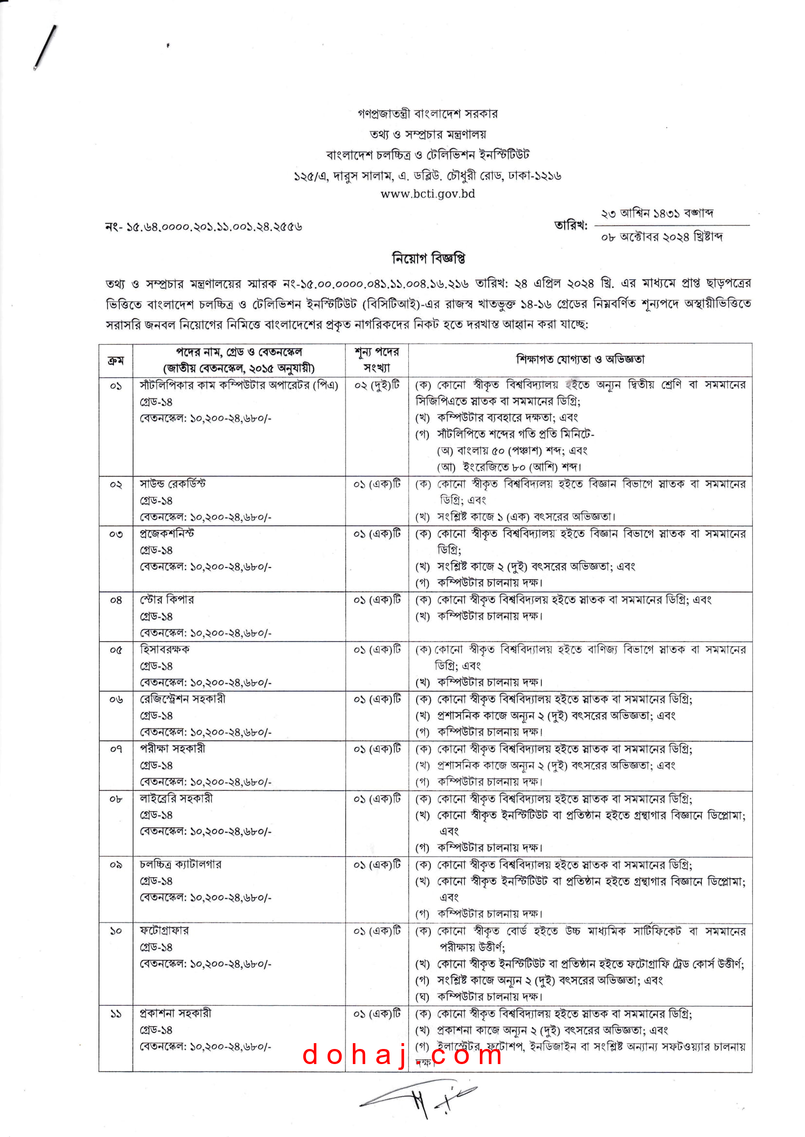 Bangladesh Cinema and Television Institute Job Circular 2024: বাংলাদেশ চলচ্চিত্র ও টেলিভিশন ইনস্টিটিউট এর শূন পদসমূহে জনবল নিয়োগের বিজ্ঞপ্তি প্রকাশ করেছে। বাংলাদেশ চলচ্চিত্র ও টেলিভিশন ইনস্টিটিউট ১৫ টি পদে মোট ২৬ জনকে নিয়োগ দেবে। উক্ত পদে নারী-পুরুষ উভয়ই আবেদন করতে পারবেন। আগ্রহী প্রার্থীরা অনলাইনে আবেদন করতে পারবেন। এই চাকরিতে সকল জেলার প্রার্থীগন আবেদন করতে পাবেন। আগ্রহ ও যোগ্যতা থাকলে আপনিও আবেদন করতে পারেন। আবেদন প্রক্রিয়াসহ সম্পূর্ণ বিজ্ঞপ্তি বিস্তারিত দেওয়া হল।