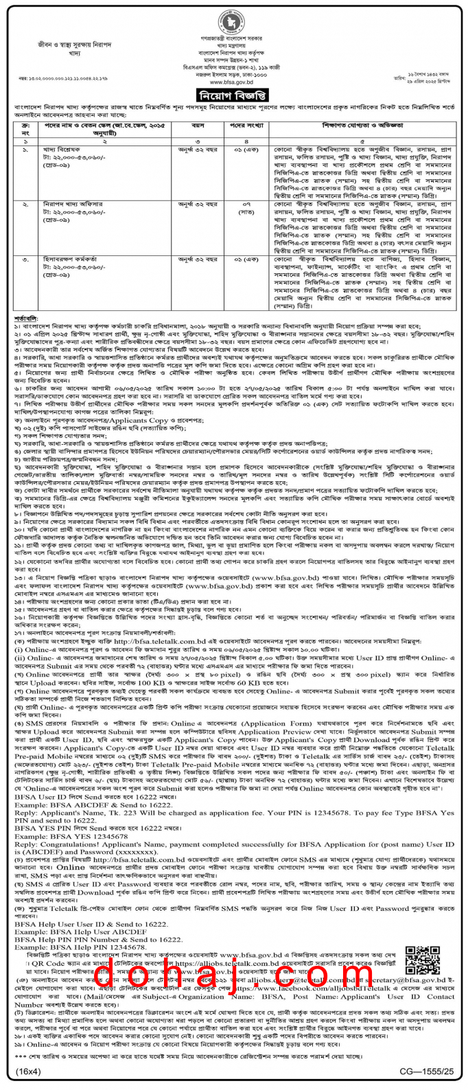 BFSA Job Circular 2025: বাংলাদেশ নিরাপদ খাদ্য কর্তৃপক্ষের শূন্য পদসমূহ পূরণের লক্ষে নিয়োগ বিজ্ঞপ্তি প্রকাশিত হয়েছে। বাংলাদেশ নিরাপদ খাদ্য কর্তৃপক্ষ ০৩ টি পদে মোট ০৯ জনকে নিয়োগ দেবে। পদগুলোতে নারী ও পুরুষ প্রার্থীরা উভয়েই আবেদন করতে পারবেন। আগ্রহী প্রার্থীরা অনলাইনে আবেদন করতে পারবেন। আবেদন প্রক্রিয়াসহ সম্পূর্ণ বিজ্ঞপ্তি বিস্তারিত দেওয়া হল।