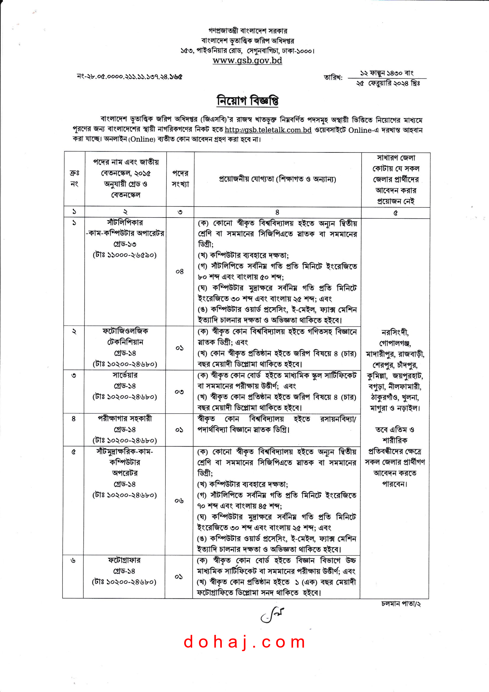 Geological Survey of Bangladesh (GSB) Job Circular 2024: বাংলাদেশ ভূতাত্ত্বিক জরিপ অধিদপ্তর (জিএসবি) এর শূন্য পদসমূহে জনবল নিয়োগ দেয়া হবে। বাংলাদেশ ভূতাত্ত্বিক জরিপ অধিদপ্তর ২২ টি পদে মোট ৮১ জনকে নিয়োগ দেবে। পদগুলোতে নারী ও পুরুষ উভয়ই প্রার্থীরা আবেদন করতে পারবেন। আগ্রহী প্রার্থীরা অনলাইনে আবেদন করতে পারবেন। আগ্রহ ও যোগ্যতা থাকলে আপনিও আবেদন করতে পারেন। সম্পূর্ণ বিজ্ঞপ্তি বিস্তারিত দেওয়া হল।