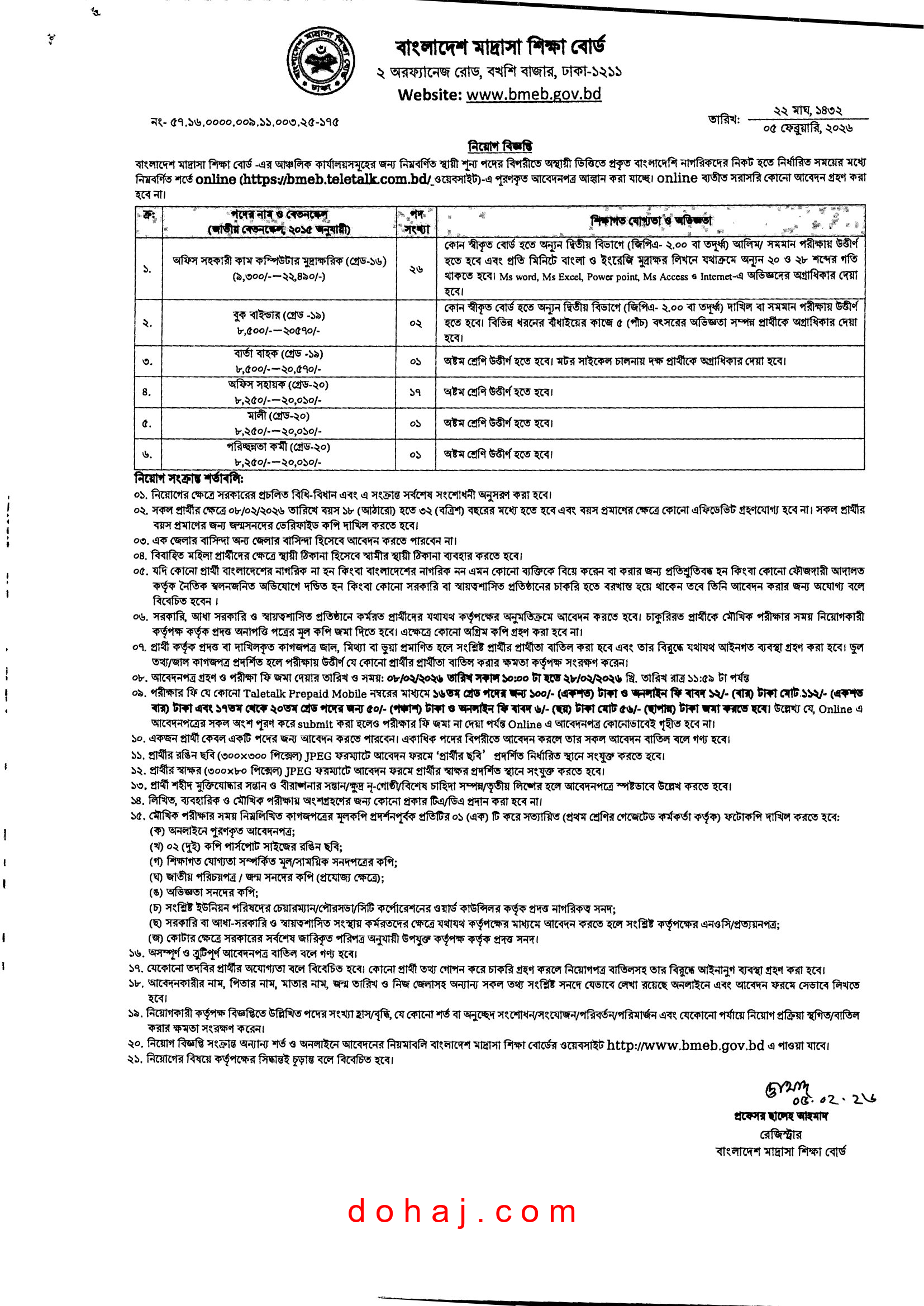 Bangladesh Madrasah Education Board (BMEB) Job Circular 2026: বাংলাদেশ মাদ্রাসা শিক্ষা বোর্ড শূন্য পদসমূহে জনবল নিয়োগের জন্য চাকরির বিজ্ঞপ্তি প্রকাশ করেছে। বাংলাদেশ মাদ্রাসা শিক্ষা বোর্ড ০৬ টি পদে মোট ৪৮ জনকে নিয়োগ দেবে। এই চাকরিতে নারী ও পুরুষ উভয়কেই নিয়োগ দেওয়া হবে। আগ্রহী প্রার্থীরা অনলাইনে আবেদন করতে পারবেন। আগ্রহ ও যোগ্যতা থাকলে আপনিও আবেদন করতে পারেন। সম্পূর্ণ চাকরির খবর বিস্তারিত দেওয়া হল।