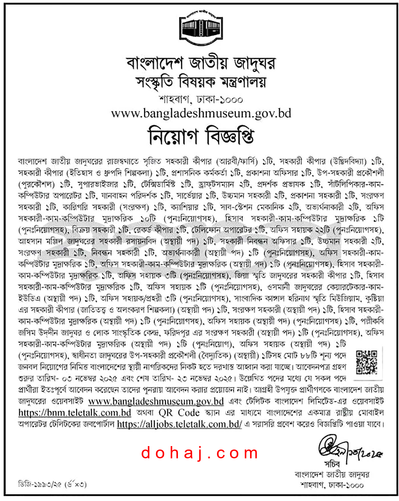 Bangladesh National Museum Job Circular 2025: বাংলাদেশ জাতীয় জাদুঘর এবং এর নিয়ন্ত্রনাধীন আহসান মঞ্জিল জদুঘর, জিয়া স্মৃতি জাদুঘর, শিল্পাচার্য জয়নুল আবেদিন সংগ্রহশালা ও ওসমানী জাদুঘরের শূন্য পদসমূহে জনবল নিয়োগের বিজ্ঞপ্তি প্রকাশ হয়েছে। বাংলাদেশ জাতীয় জাদুঘর ৪৯টি পদে মোট ৮৮ জনকে নিয়োগ দেবে। আগ্রহ ও যোগ্যতা থাকলে আপনিও আবেদন করতে পারেন। নারী ও পুরুষ উভয়কেই নিয়োগ দেওয়া হবে। আগ্রহী প্রার্থীরা অনলাইনে আবেদন করতে পারবেন। সম্পূর্ন বিজ্ঞপ্তি বিস্তারিত দেয়া হল:
