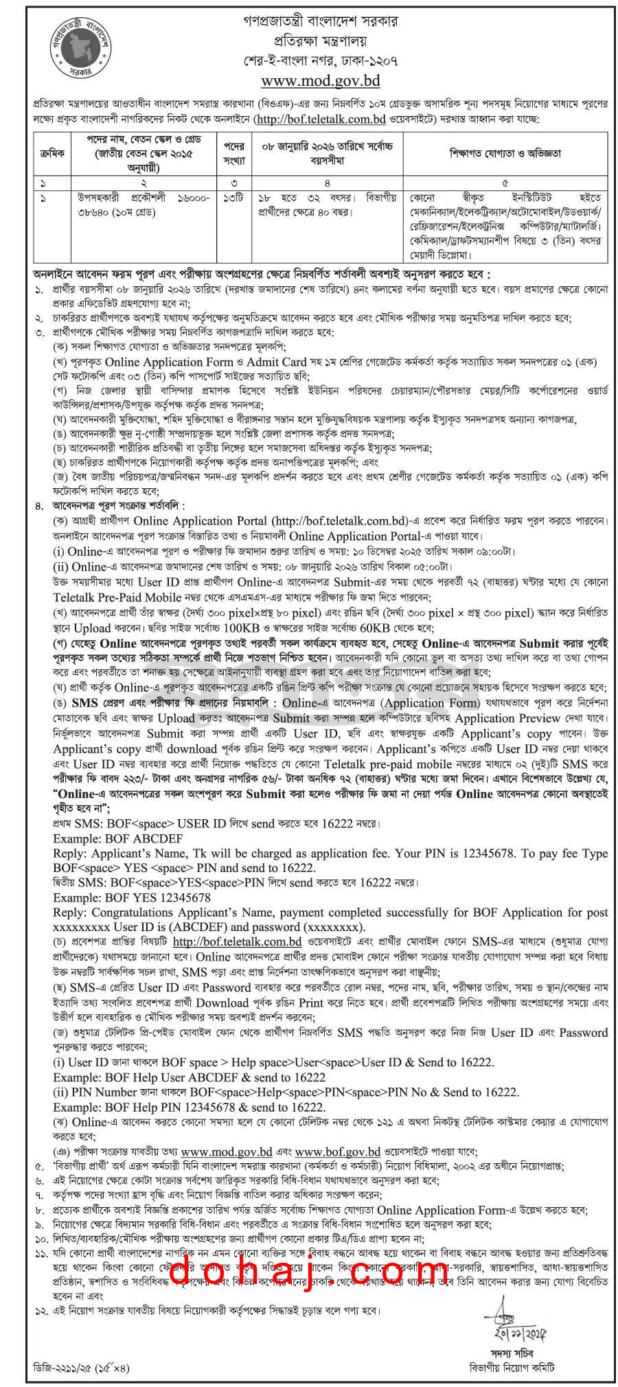 BOF Job Circular 2025: প্রতিরক্ষা মন্ত্রণালয়ের নিয়ন্ত্রণাধীন বাংলাদেশ সমরাস্ত্র কারখানা তাদের শূন্য পদসমূহের জন্য জনবল নিয়োগের বিজ্ঞপ্তি প্রকাশ করেছে। বাংলাদেশ সমরাস্ত্র কারখানা ০১ টি পদে মোট ১৩ জনকে নিয়োগ দেবে। উক্ত পদ গুলোতে নারী-পুরুষ উভয়ই আবেদন করতে পারবেন। আগ্রহী প্রার্থীরা অনলাইনে আবেদন করতে পারবেন। সম্পূর্ণ বিজ্ঞপ্তি বিস্তারিত দেওয়া হল।