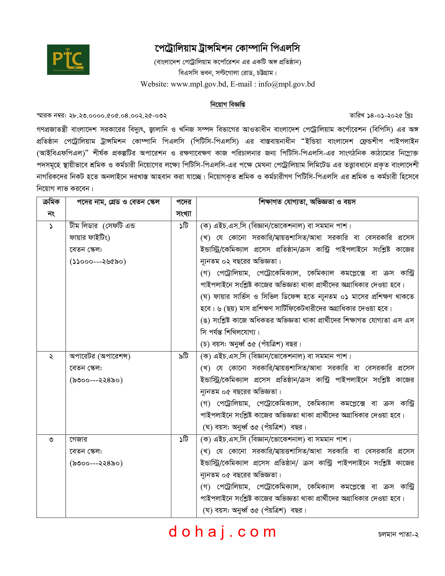 বাংলাদেশ পেট্রোলিয়াম কর্পোরেশন এর অঙ্গ প্রতিষ্ঠান পেট্রোলিয়াম ট্রান্সমিশন কোম্পানি পিএলসি’র স্থায়ী শূন্য পদসমূহে জনবল নিয়োগের বিজ্ঞপ্তি প্রকাশ করেছে। পেট্রোলিয়াম ট্রান্সমিশন কোম্পানি পিএলসি ১১ টি পদে মোট ২৮ জনকে নিয়োগ দেবে। আগ্রহী প্রার্থীরা অনলাইনে আবেদন করতে পারবেন। আগ্রহ ও যোগ্যতা থাকলে আপনিও আবেদন করতে পারেন। আবেদন প্রক্রিয়াসহ সম্পূর্ণ বিজ্ঞপ্তি বিস্তারিত দেওয়া হল: