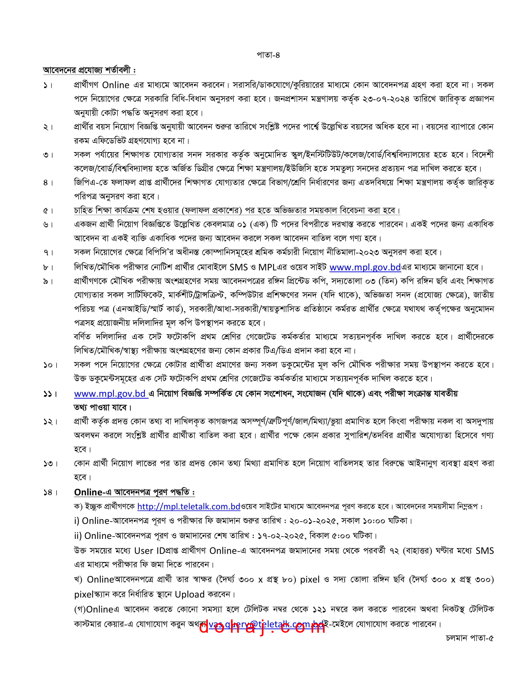 আবেদন প্রক্রিয়া: আগ্রহী প্রার্থীরা অনলাইনে http://mpl.teletalk.com.bd/ এই ওয়েবসাইটে গিয়ে আবেদনপত্র পূরণ করতে পারবেন।
