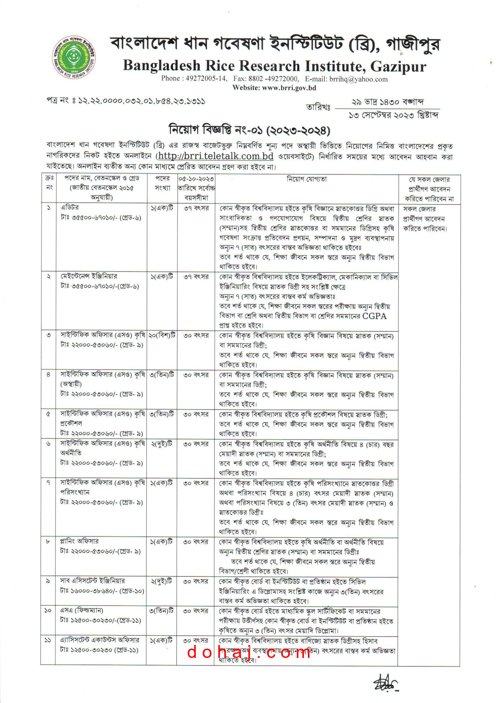 বাংলাদেশ ধান গবেষণা ইনস্টিটিউট (ব্রি) এর শূন্য পদসমূহে জনবল নিয়োগের বিজ্ঞপ্তি প্রকাশ করেছে। বাংলাদেশ ধান গবেষণা ইনস্টিটিউট ২৬ টি পদে মোট ৭৪ জনকে নিয়োগ দেবে। উক্ত পদে নারী-পুরুষ উভয়ই আবেদন করতে পারবেন। আগ্রহী প্রার্থীরা অনলাইনে আবেদন করতে পারবেন। এই চাকরিতে সকল জেলার প্রার্থীদের আবেদন করার সুযোগ আছে। আগ্রহ ও যোগ্যতা থাকলে আপনিও আবেদন করতে পারেন। আবেদন প্রক্রিয়াসহ সম্পূর্ণ বিজ্ঞপ্তি বিস্তারিত দেওয়া হল: