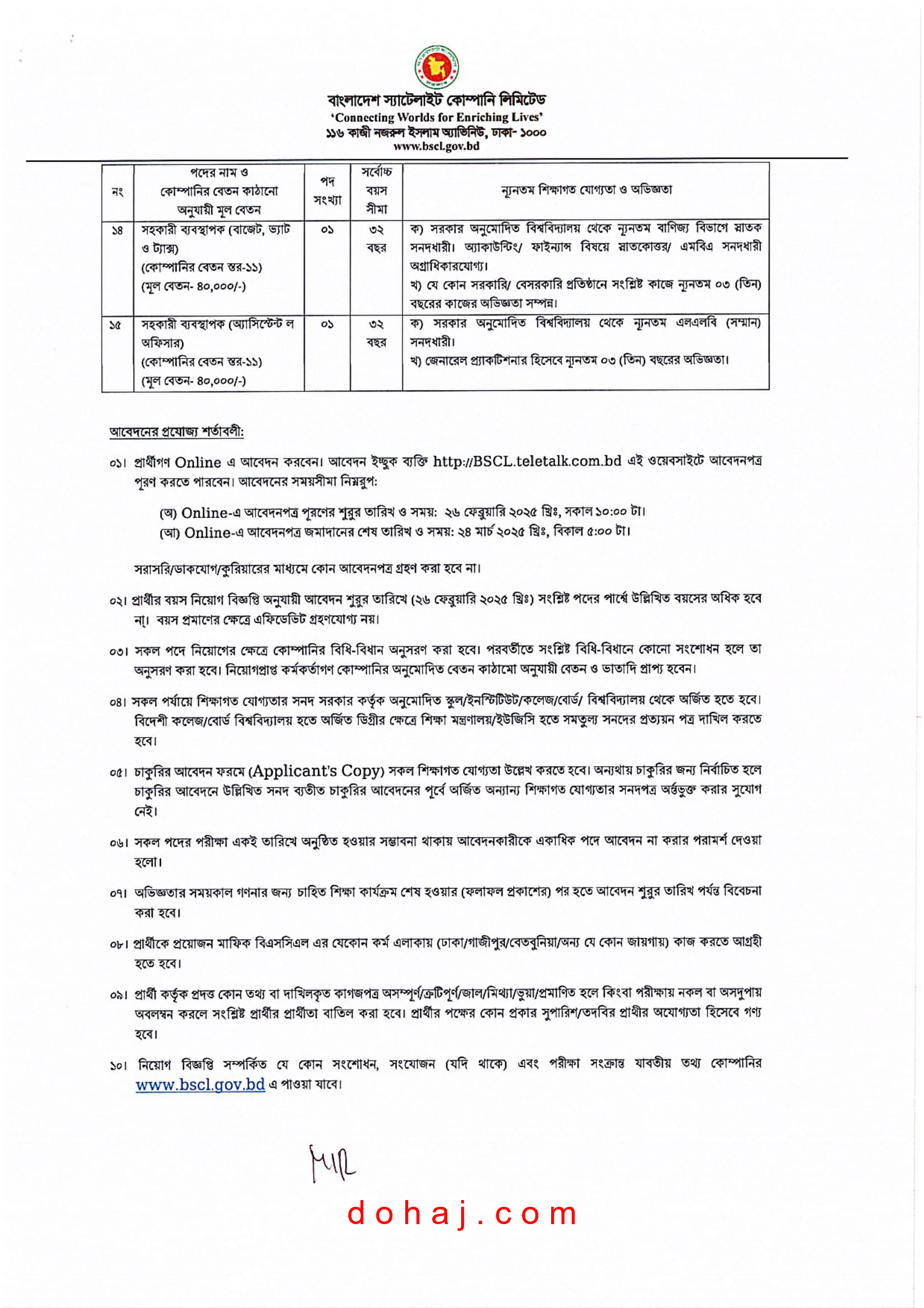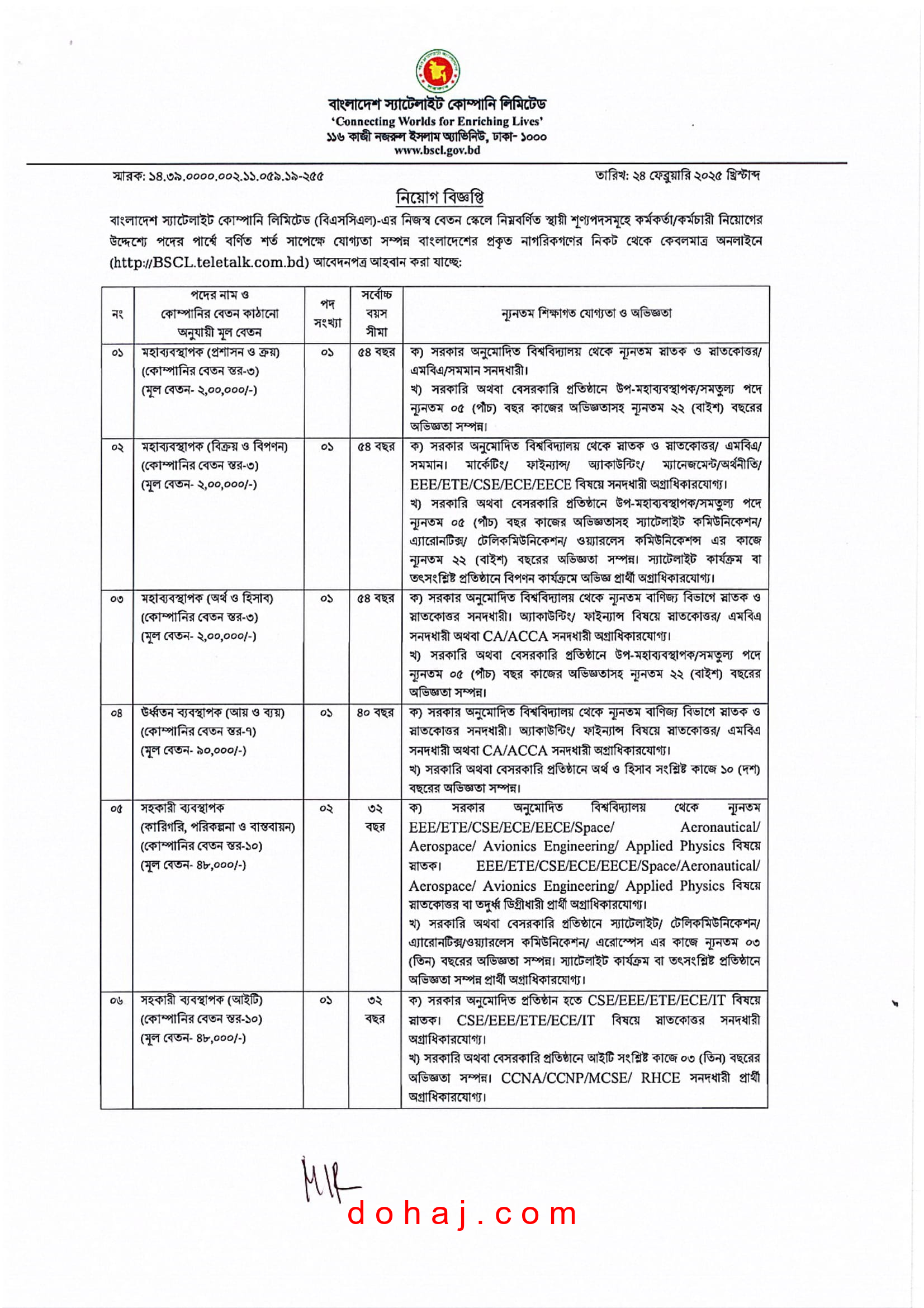 BSCL Job Circular 2025: বাংলাদেশ স্যাটেলাইট কোম্পানি লিমিটেড (বিএসসিএল) এ শূন্য পদসমূহে লোকবল নিয়োগ দেয়ার লক্ষে নিয়োগ বিজ্ঞপ্তি প্রকাশ হয়েছে। বাংলাদেশ স্যাটেলাইট কোম্পানি লিমিটেড ১৫ টি পদে মোট ২০ জনকে নিয়োগ দেবে। আগ্রহ ও যোগ্যতা থাকলে আপনিও আবেদন করতে পারেন। নারী ও পুরুষ উভয়কেই নিয়োগ দেওয়া হবে। আগ্রহী প্রার্থীরা অনলাইনে আবেদন করতে পারবেন। সম্পূর্ন বিজ্ঞপ্তি বিস্তারিত দেয়া হল।