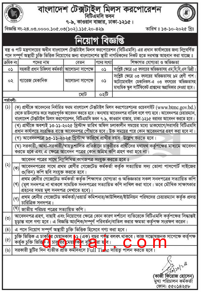 BTMC Job circular 2025: বাংলাদেশ টেক্সটাইল মিলস করপোরেশন (বিটিএমসি) এর প্রধান কার্যালয়ের শূন্য পদসমূহে জনবল নিয়োগ দেয়া হবে। বাংলাদেশ টেক্সটাইল মিলস করপোরেশন ০২ টি পদে মোট ০২ জনকে নিয়োগ দেবে। আগ্রহ ও যোগ্যতা থাকলে আপনিও আবেদন করতে পারেন। সম্পূর্ণ বিজ্ঞপ্তি বিস্তারিত দেওয়া হল।