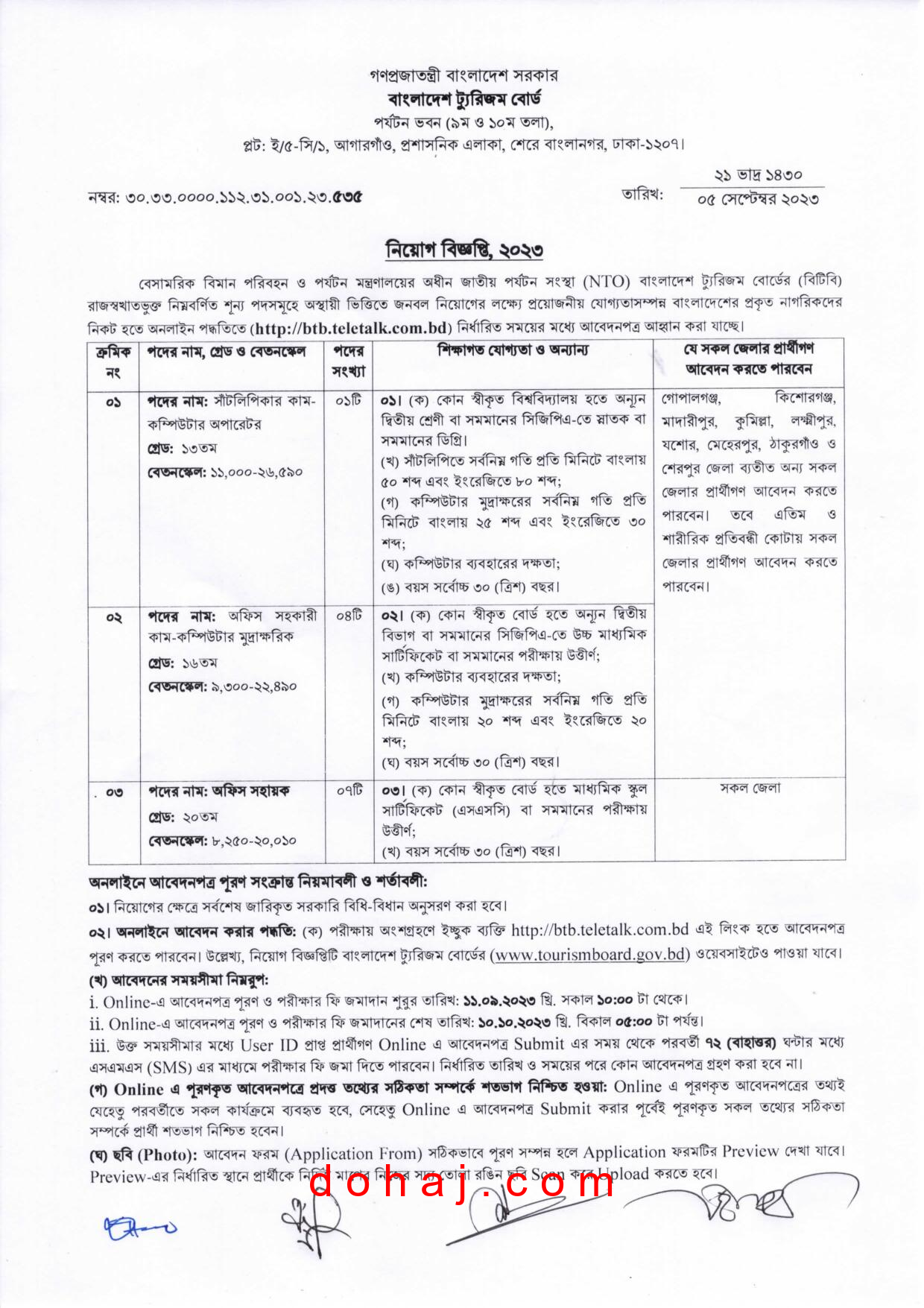 BTB Job Circular 2023: বেসামরিক বিমান পরিবহন ও পর্যটন মন্ত্রণালয়ের অধীন সংস্থা বাংলাদেশ ট্যুরিজম বোর্ডের শূন্য পদসমূহে জনবল নিয়োগ দেয়া হবে। বাংলাদেশ ট্যুরিজম বোর্ড ০৩ টি পদে মোট ১২ জনকে নিয়োগ দেবে। পদগুলোতে সকল জেলার নারী ও পুরুষ উভয়েই আবেদন করতে পারবেন। আগ্রহী প্রার্থীরা অনলাইনে আবেদন করতে পারবেন। সম্পূর্ণ বিজ্ঞপ্তি বিস্তারিত দেওয়া হল। সরকারি বেসরকারি সকল চাকরির খবর সবার আগে পড়তে আমাদের চাকরির খবর পেজে বিজিট করুন।