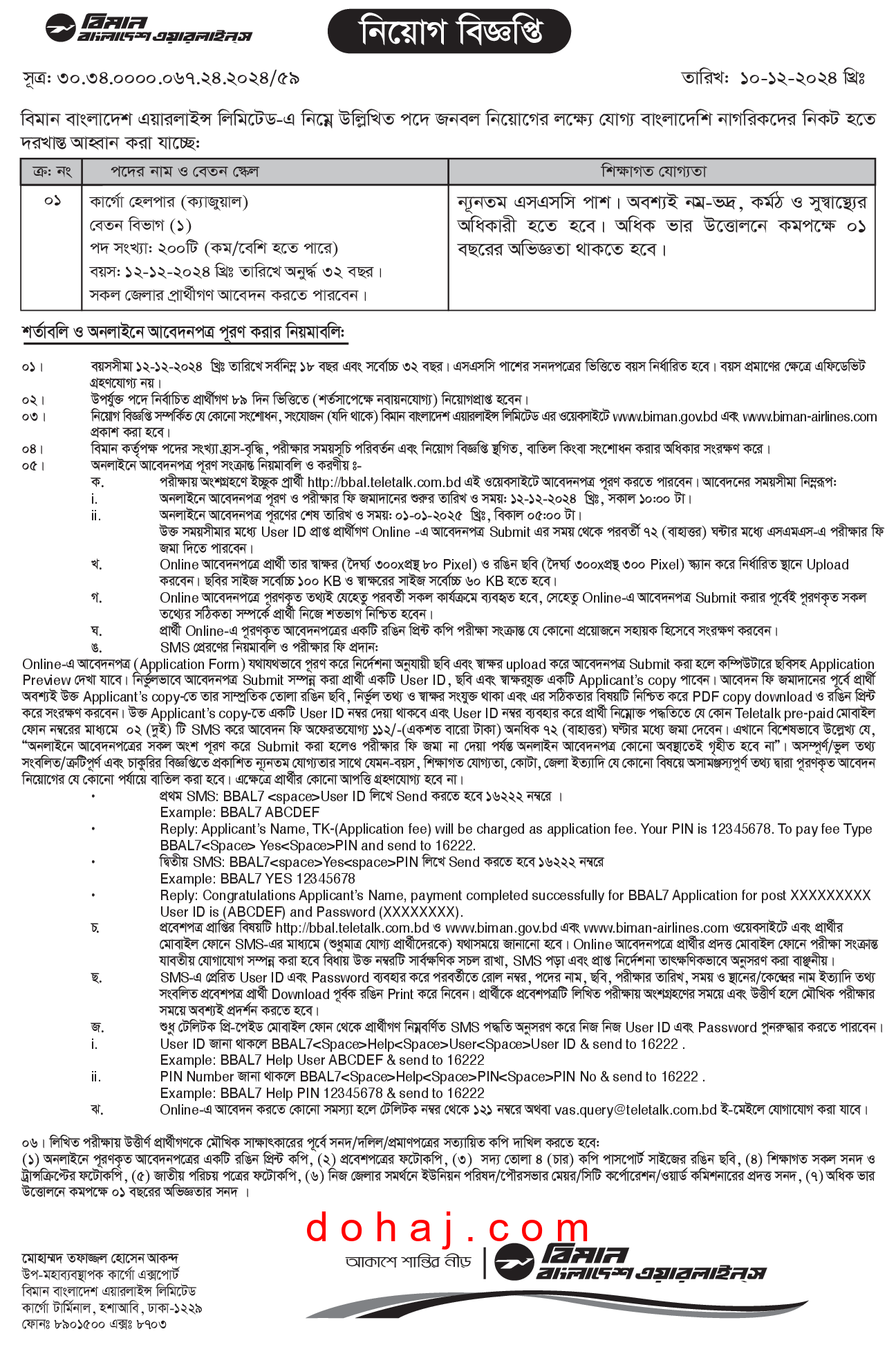 বিমান বাংলাদেশ এয়ারলাইনস লিমিটেড কার্গো হেলপার পদে জনবল নিয়োগ দেবে। বিমান বাংলাদেশ এয়ারলাইনস লিমিটেড ০১ টি পদে মোট ২০০ জনকে নিয়োগ দেবে। এই চাকরিতে সকল জেলার প্রার্থীরা আবেদন করতে পারবেন। আগ্রহী প্রার্থীরা অনলাইনে আবেদন করতে পারবেন। আগ্রহ ও যোগ্যতা থাকলে আপনিও আবেদন করতে পারেন। সম্পূর্ণ বিজ্ঞপ্তি বিস্তারিত দেওয়া হল।