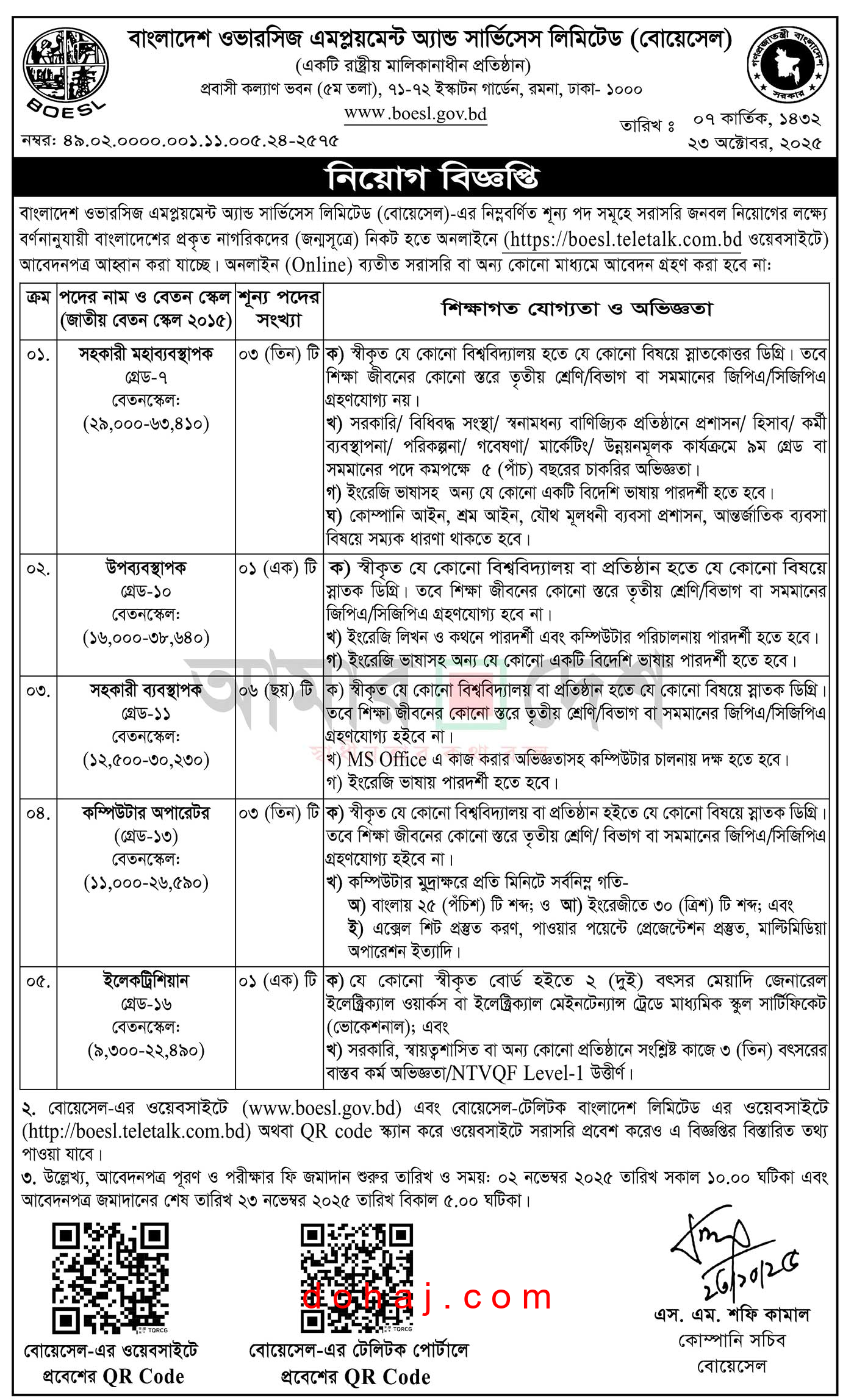 আবেদন প্রক্রিয়া: আগ্রহী প্রার্থীরা অনলাইনে http://boesl.teletalk.com.bd এই ওয়েবসাইটে গিয়ে আবেদনপত্র পূরণ করতে পারবেন।
