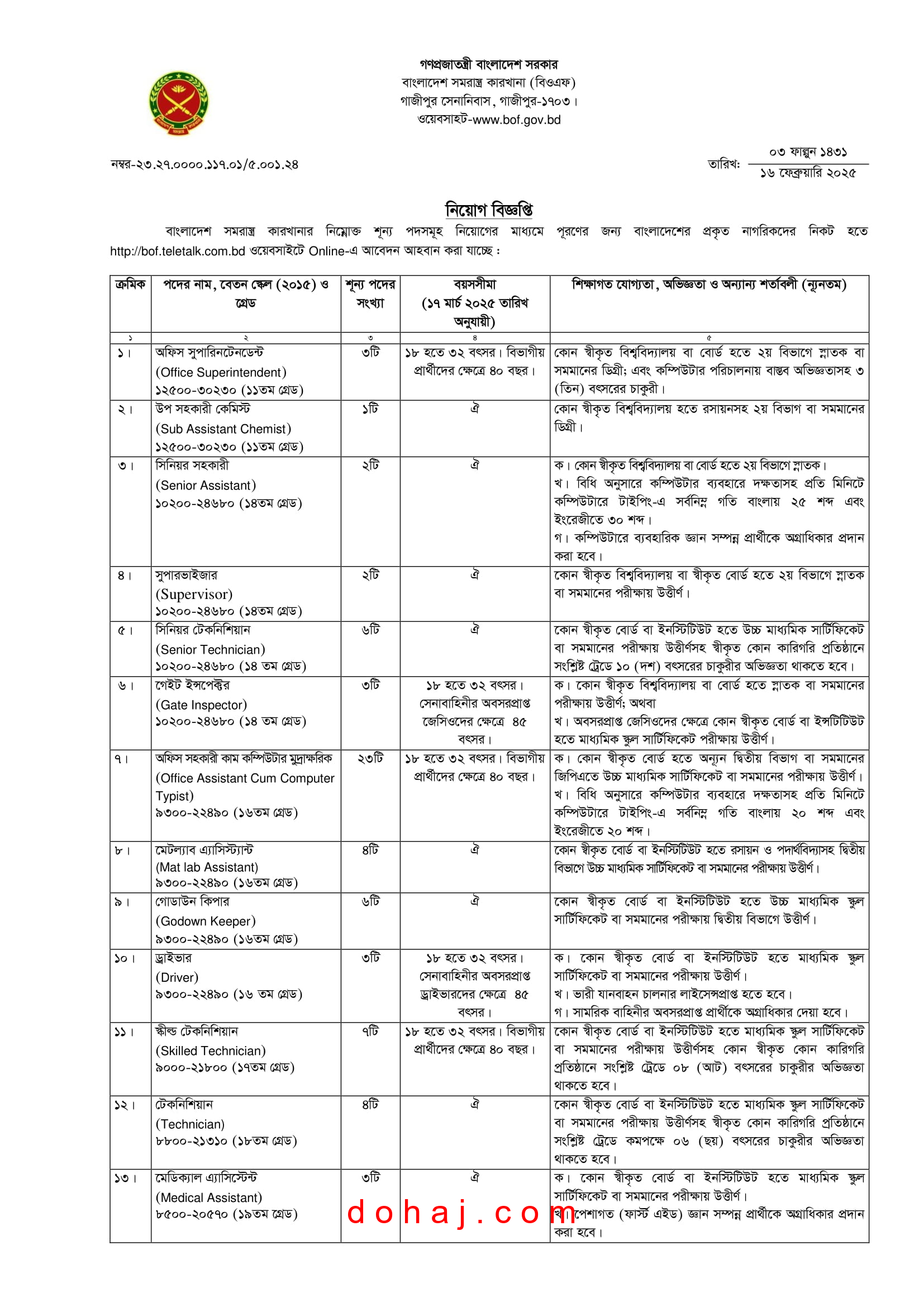 BOF Job Circular 2025: প্রতিরক্ষা মন্ত্রণালয়ের নিয়ন্ত্রণাধীন বাংলাদেশ সমরাস্ত্র কারখানা তাদের শূন্য পদসমূহের জন্য জনবল নিয়োগের বিজ্ঞপ্তি প্রকাশ করেছে। বাংলাদেশ সমরাস্ত্র কারখানা ২০ টি পদে মোট ২২০ জনকে নিয়োগ দেবে। উক্ত পদ গুলোতে নারী-পুরুষ উভয়ই আবেদন করতে পারবেন। আগ্রহী প্রার্থীরা অনলাইনে আবেদন করতে পারবেন। সম্পূর্ণ বিজ্ঞপ্তি বিস্তারিত দেওয়া হল।