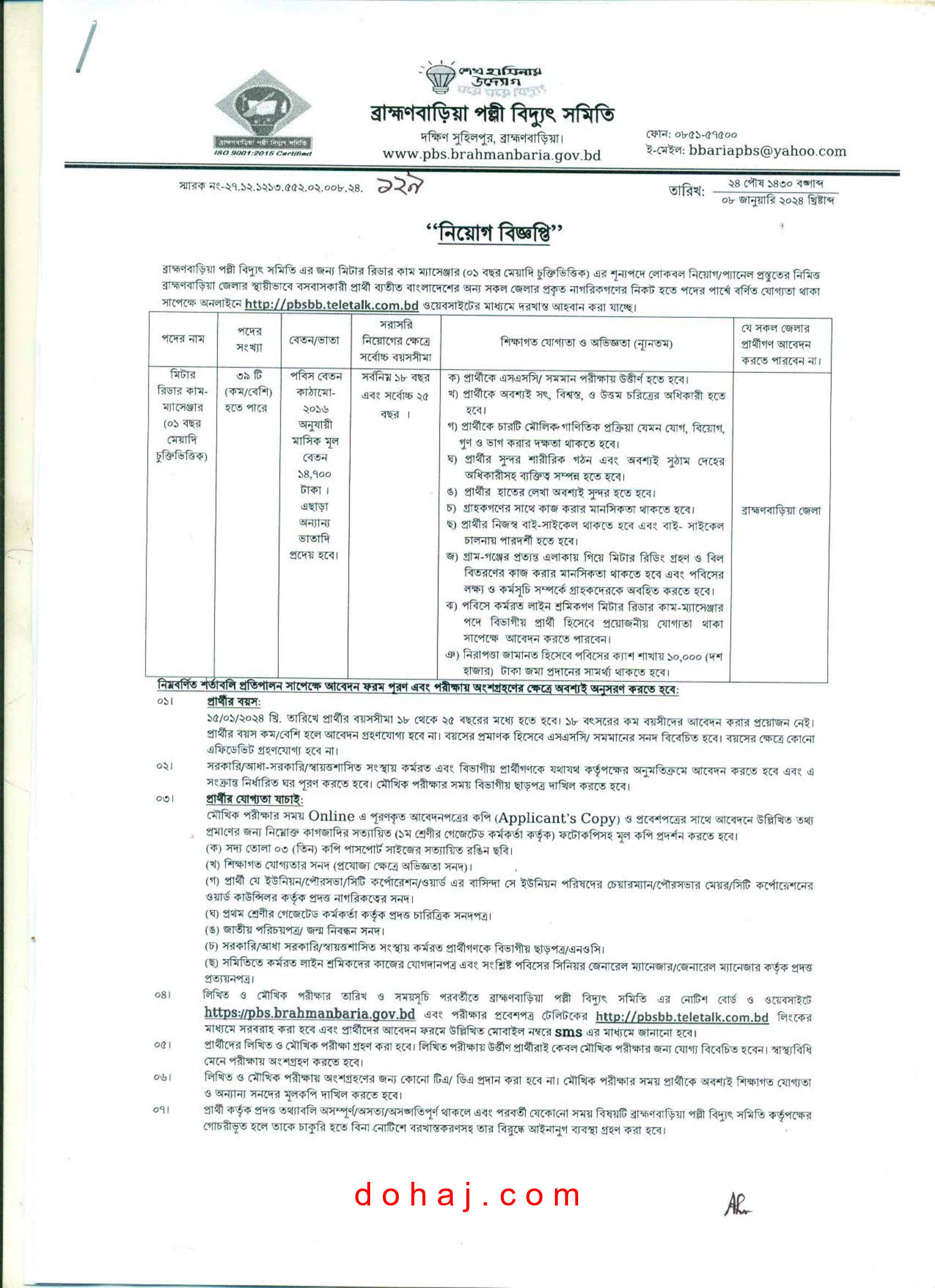 Brahmanbaria Palli Bidyut Samity Job Circular: ব্রাহ্মণবাড়িয়া পল্লী বিদ্যুৎ সমিতি জনবল নিয়োগের বিজ্ঞপ্তি প্রকাশ করেছে। ব্রাহ্মণবাড়িয়া পল্লী বিদ্যুৎ সমিতি ০১ টি পদে মোট ৩৯ জনকে নিয়োগ দেবে। আগ্রহী প্রার্থীরা অনলাইনে আবেদন করতে পারবেন। এই চাকরিতে ব্রাহ্মণবাড়িয়া জেলার স্থায়ী বাসিন্দা ছাড়া বাকী সকল জেলার প্রার্থীরা আবেদন করতে পারবেন। আগ্রহ ও যোগ্যতা থাকলে আপনিও আবেদন করতে পারেন। সম্পূর্ণ বিজ্ঞপ্তি বিস্তারিত দেওয়া হল।