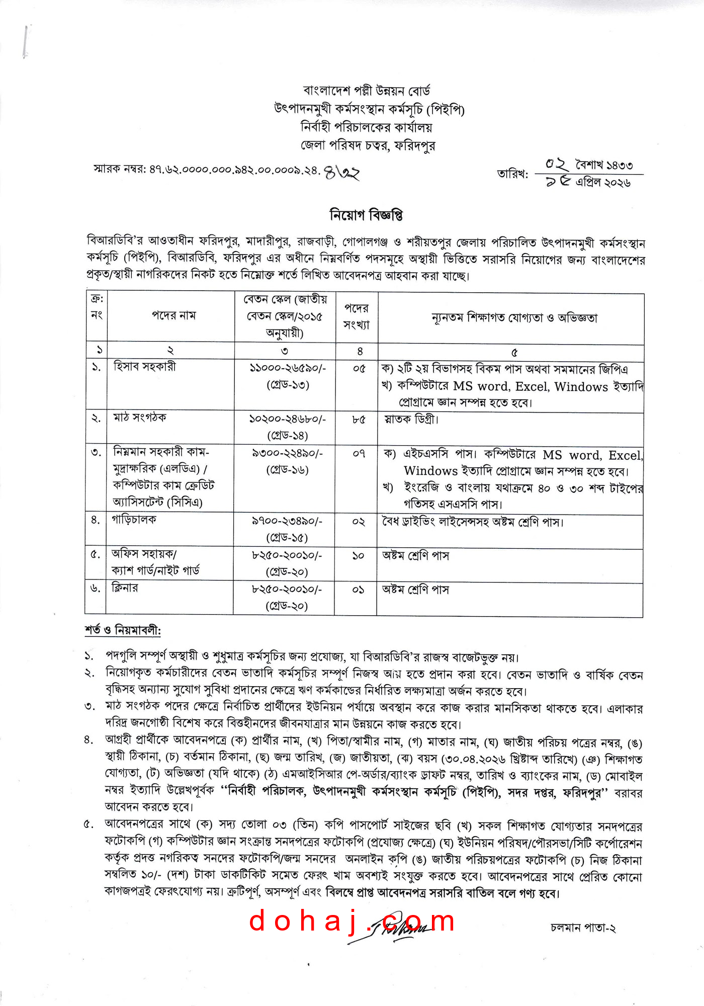 আবেদনের নিয়ম: আগ্রহী প্রার্থীকে আবেদনপত্রে (ক) প্রার্থীর নাম, (খ) পিতা/স্বামীর নাম, (গ) মাতার নাম, (ঘ) জাতীয় পরিচয় পত্রের নম্বর, (ঙ) স্থায়ী ঠিকানা, (চ) বর্তমান ঠিকানা, (ছ) জন্ম তারিখ, (জ) জাতীয়তা, (ঝ) বয়স (৩০.০৪.২০২৬ খ্রিষ্টাব্দ তারিখে) (ঞ) শিক্ষাগত যোগ্যতা, (ট) অভিজ্ঞতা (যদি থাকে) (ঠ) এমআইসিআর পে-অর্ডার/ব্যাংক ড্রাফট নম্বর, তারিখ ও ব্যাংকের নাম, (ড) মোবাইল নম্বর ইত্যাদি উল্লেখপূর্বক “নির্বাহী পরিচালক, উৎপাদনমুখী কর্মসংস্থান কর্মসূচি (পিইপি), সদর দপ্তর, ফরিদপুর” বরাবর আবেদন করতে হবে।
