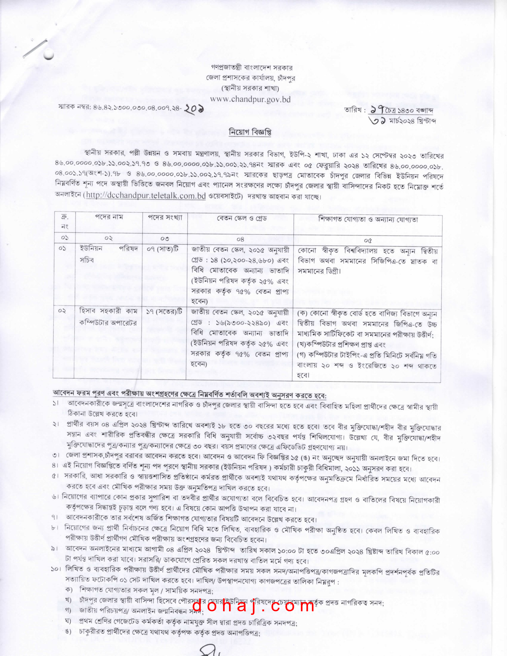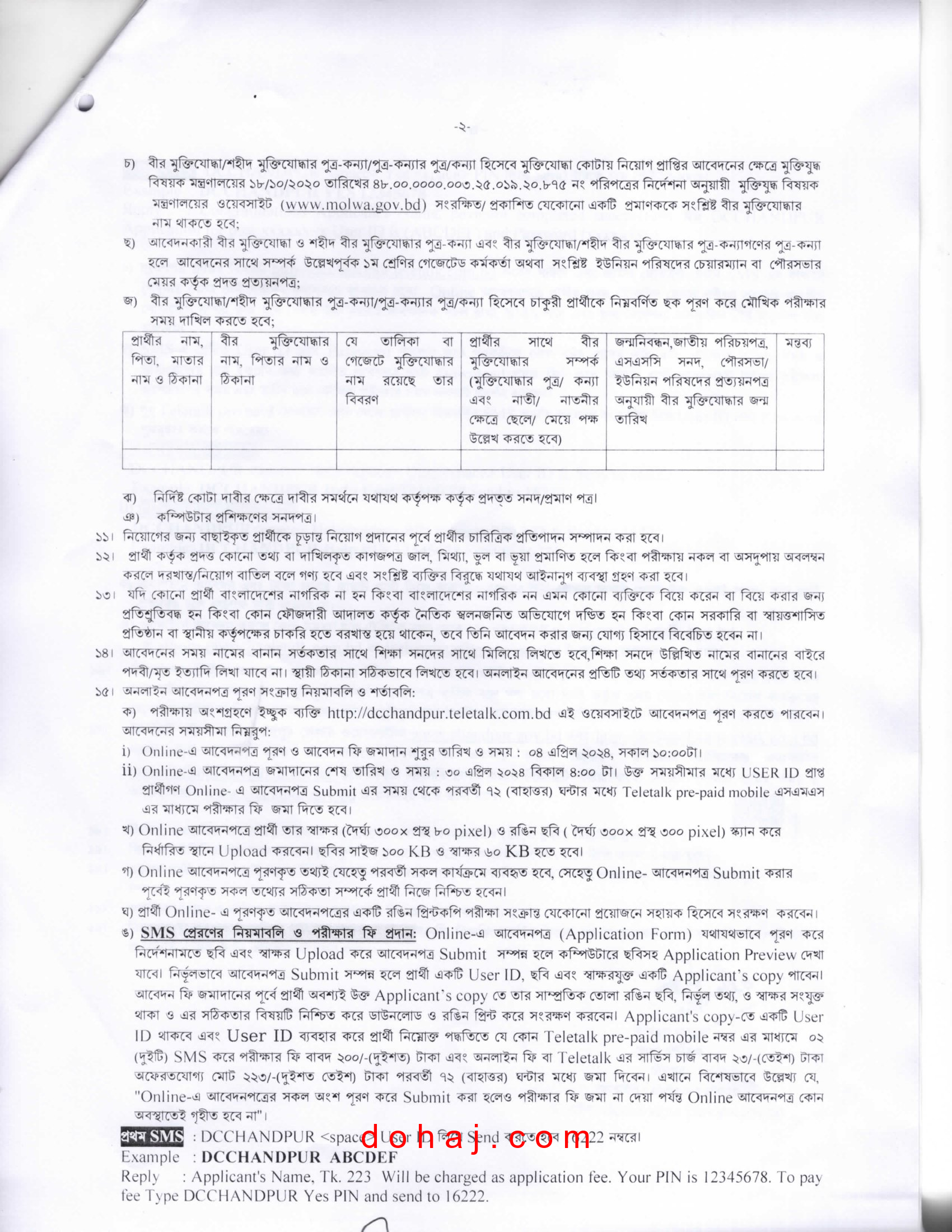 আবেদন প্রক্রিয়া: আবেদন করতে হবে অনলাইনে http://dcchandpur.teletalk.com.bd ওয়েবসাইটের মাধমে অনলাইনে আবেদনপত্র পাঠাতে হবে।