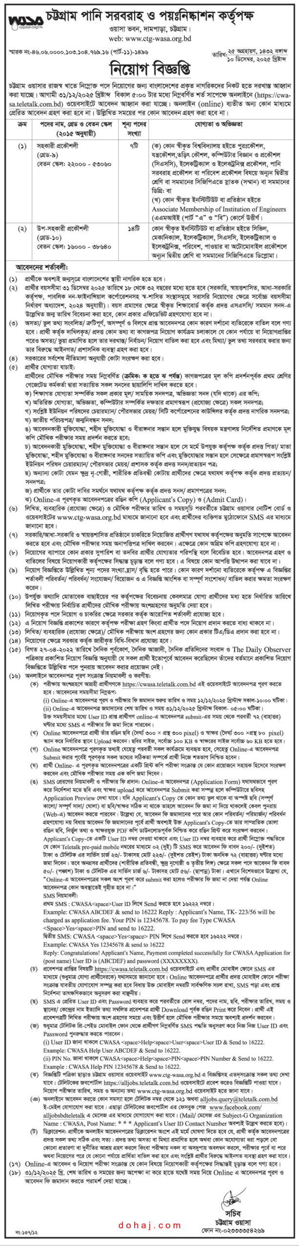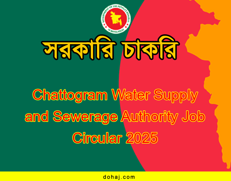 চট্টগ্রাম পানি সরবরাহ ও পয়ঃনিষ্কাশন কর্তৃপক্ষ (চট্টগ্রাম ওয়াসা) নিয়োগ বিজ্ঞপ্তি ২০২৫ অনুযায়ী পদের নাম, পদসংখ্যা, বেতন স্কেল, বয়সসীমা, শিক্ষাগত যোগ্যতা, অভিজ্ঞতা, আবেদন ফি, আবেদনের শেষ তারিখসহ সকল বিস্তারিত তথ্য নিচের দেওয়া অফিসিয়াল বিজ্ঞপ্তিতে উল্লেখ করা আছে। তাই কোনো গুজব বা ভুয়া তথ্যে বিভ্রান্ত না হয়ে অবশ্যই অফিসিয়াল বিজ্ঞপ্তি (PDF/ইমেজ) ভালো করে পড়ে নিন এবং সঠিক নিয়মে আবেদন করুন।
