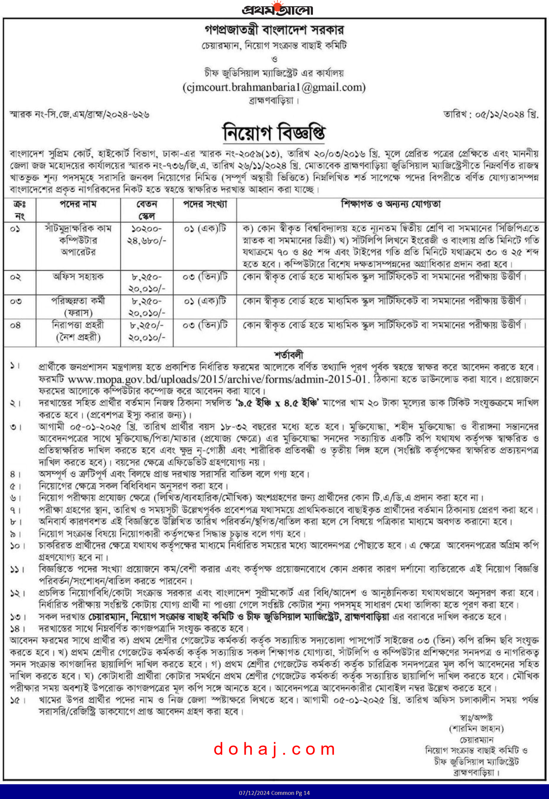 CJM Job Circular 2024: চিফ জুডিশিয়াল ম্যাজিস্ট্রেট কার্যালয়ে এর শূন্য পদসমূহে জনবল নিয়োগ দেয়া হবে। চিফ জুডিশিয়াল ম্যাজিস্ট্রেট কোর্ট, যশোরে ০৮ টি পদে মোট ১৫ জনকে নিয়োগ দেবে এবং ব্রাহ্মণবাড়িয়া কোর্টে ০৪ টি পদে মোট ৮ জনকে নিয়োগ দেবে। আগ্রহী প্রার্থীরা অনলাইনে ও ডাকযোগে আবেদন করতে পারবেন। আগ্রহ ও যোগ্যতা থাকলে আপনিও আবেদন করতে পারেন। আবেদন প্রক্রিয়াসহ সম্পূর্ণ বিজ্ঞপ্তি বিস্তারিত দেওয়া হল: