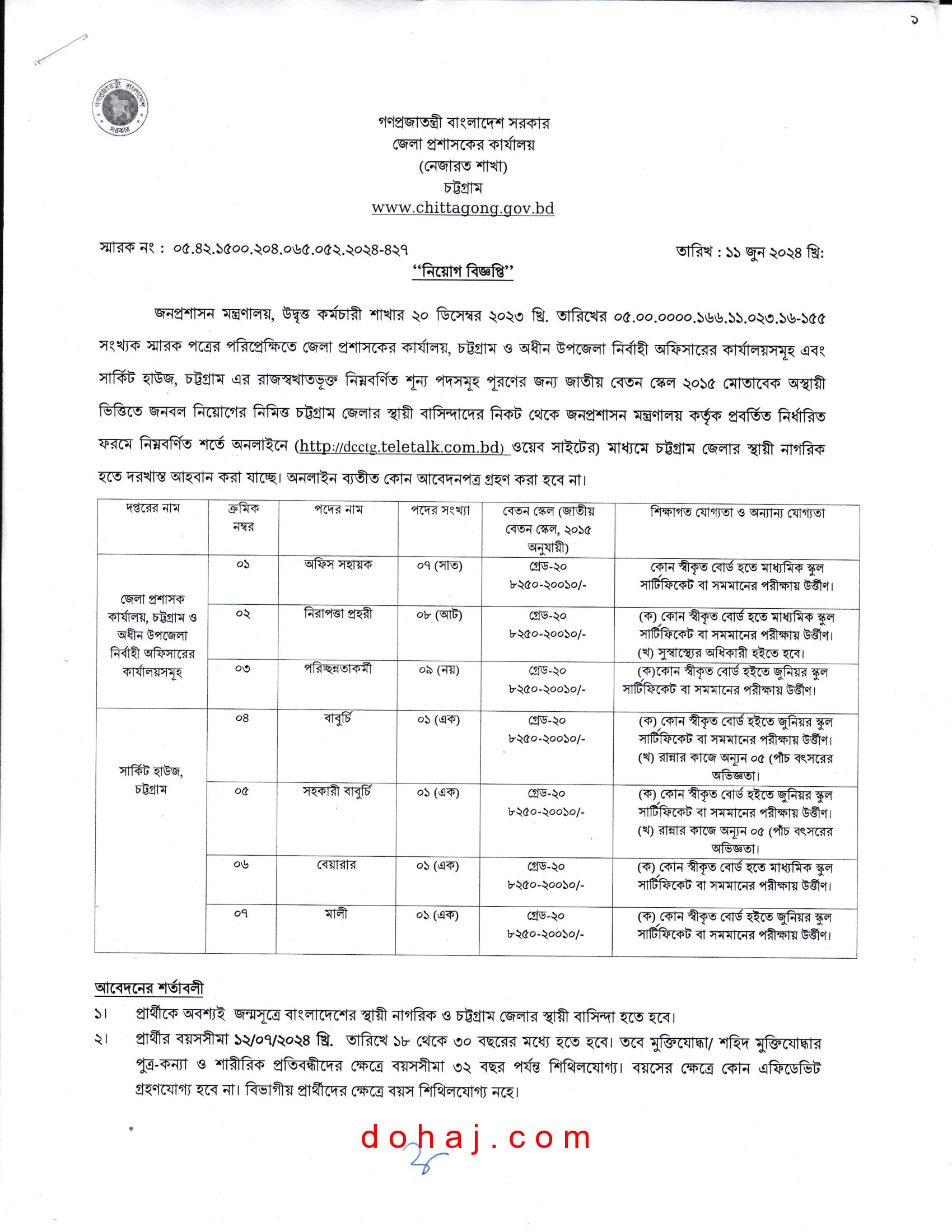 Chittagong DC office Job 2024: চট্টগ্রাম জেলা প্রশাসকের কার্যালয়ে শূন্য পদে লোক নিয়োগ দেয়া হবে। চট্টগ্রাম জেলা প্রশাসক কার্যালয় ০৮ টি পদে মোট ৪২ জনকে নিয়োগ দেবে। এই চাকরিতে চট্টগ্রাম জেলার স্থায়ী বাসিন্দারা শুধু আবেদন করতে পারবেন। আগ্রহী প্রার্থীরা অনলাইনে আবেদন করতে পারবেন। পদগুলোতে নারী ও পুরুষ উভয়ই প্রার্থীরা আবেদন করতে পারবেন। সম্পূর্ণ বিজ্ঞপ্তি বিস্তারিত দেওয়া হল।
