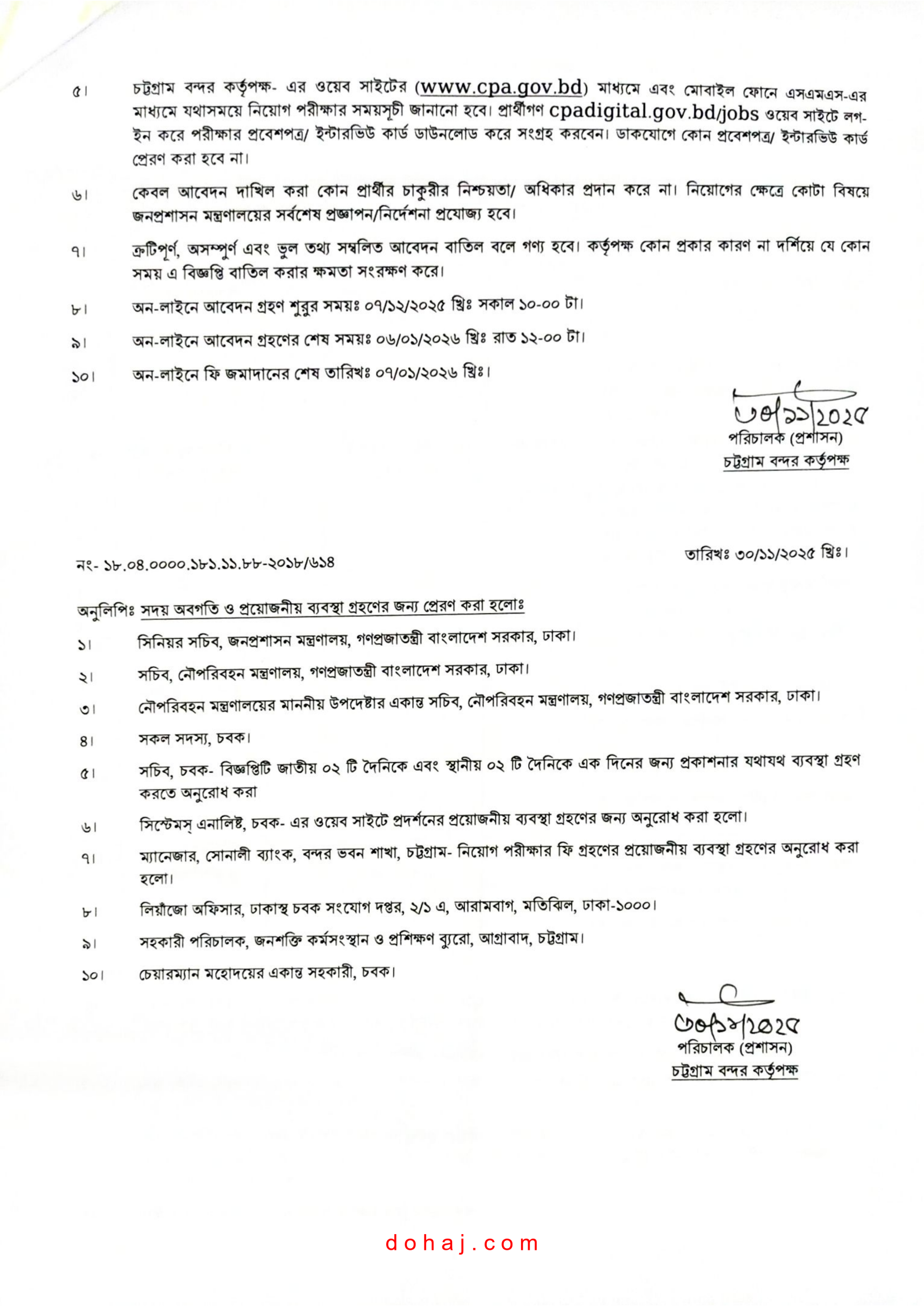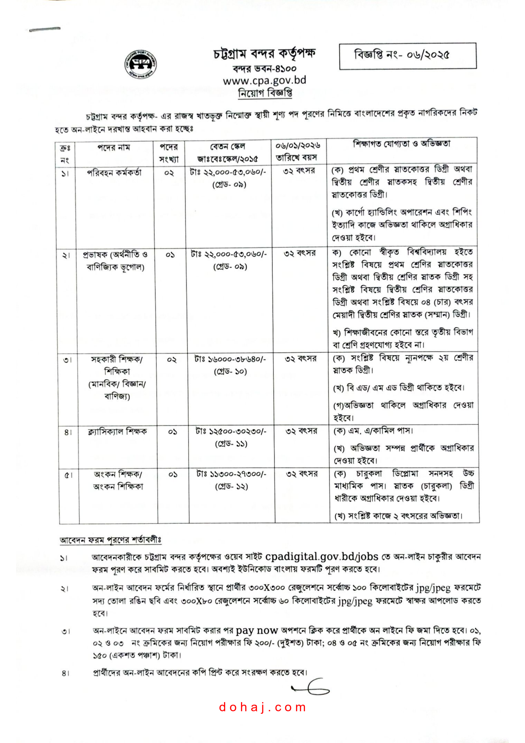 CPA Job Circular 2026: চট্টগ্রাম বন্দর কর্তৃপক্ষ বিভিন্ন শূন্য পদসমূহে স্থায়ী ভাবে লোক নিয়োগের বিজ্ঞপ্তি প্রকাশ করেছে। চট্টগ্রাম বন্দর কর্তৃপক্ষ ০৫ টি পদে মোট ০৭ জনকে নিয়োগ দেবে। পদগুলোতে নারী ও পুরুষ উভয়েই আবেদন করতে পারবেন। আগ্রহী প্রার্থীরা অনলাইনে আবেদন করতে পারবেন। আগ্রহ ও যোগ্যতা থাকলে আপনিও আবেদন করতে পারবেন। সম্পূর্ন বিজ্ঞপ্তি বিস্তারিত দেয়া হল।