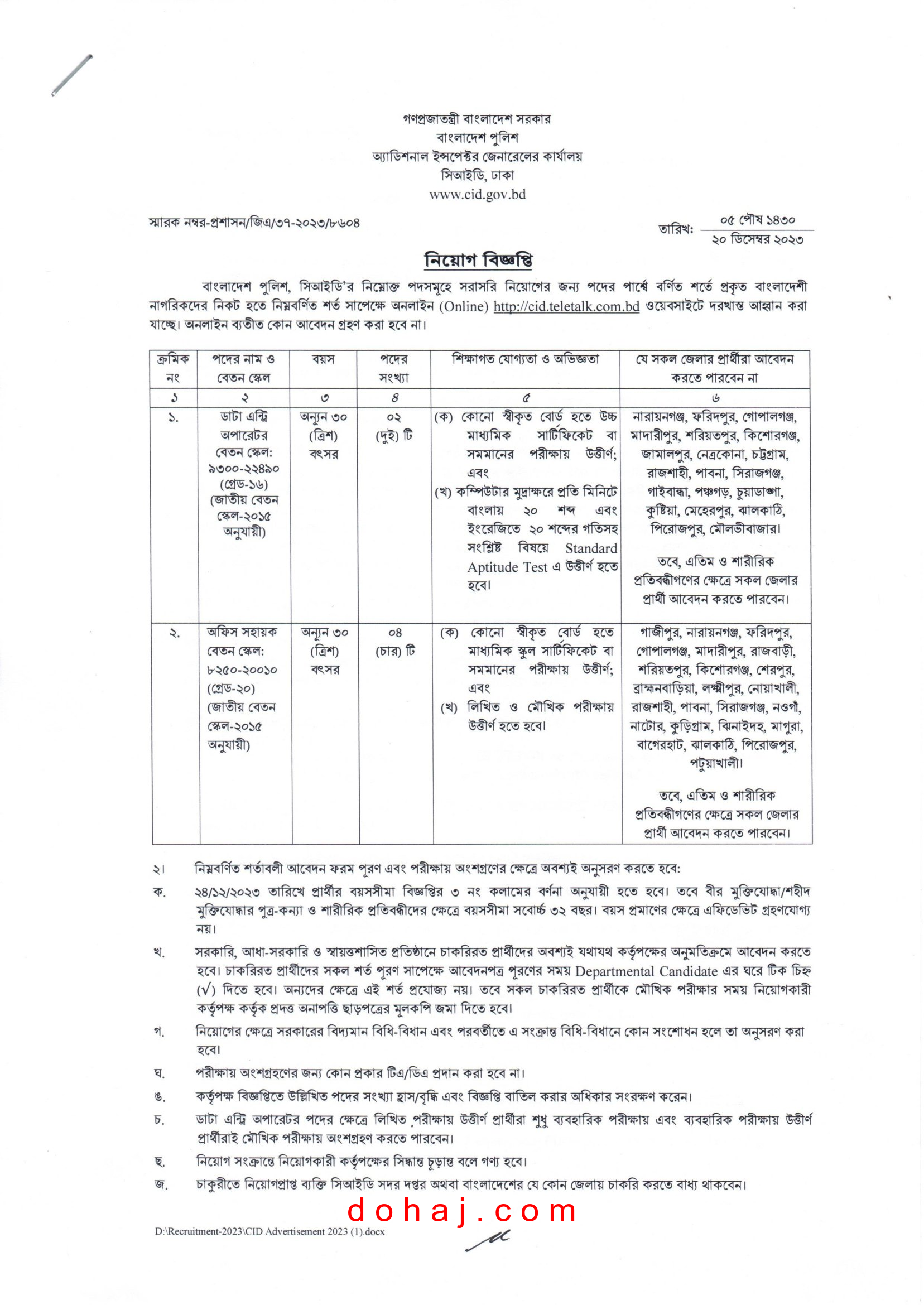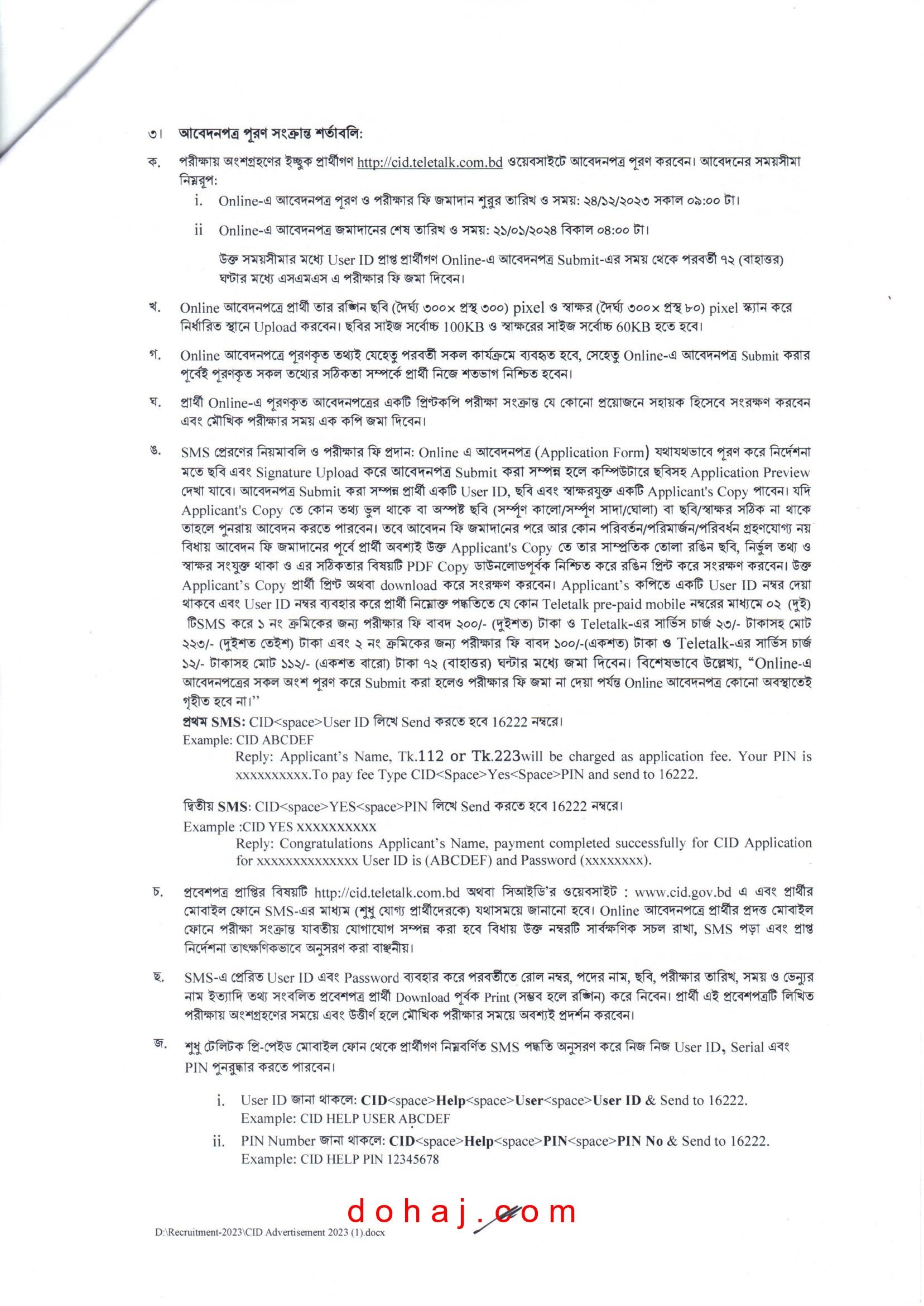 আবেদন প্রক্রিয়া: আগ্রহী প্রার্থীরা অনলাইনে http://cid.teletalk.com.bd এই ওয়েবসাইটে গিয়ে আবেদনপত্র পূরণ করতে পারবেন।