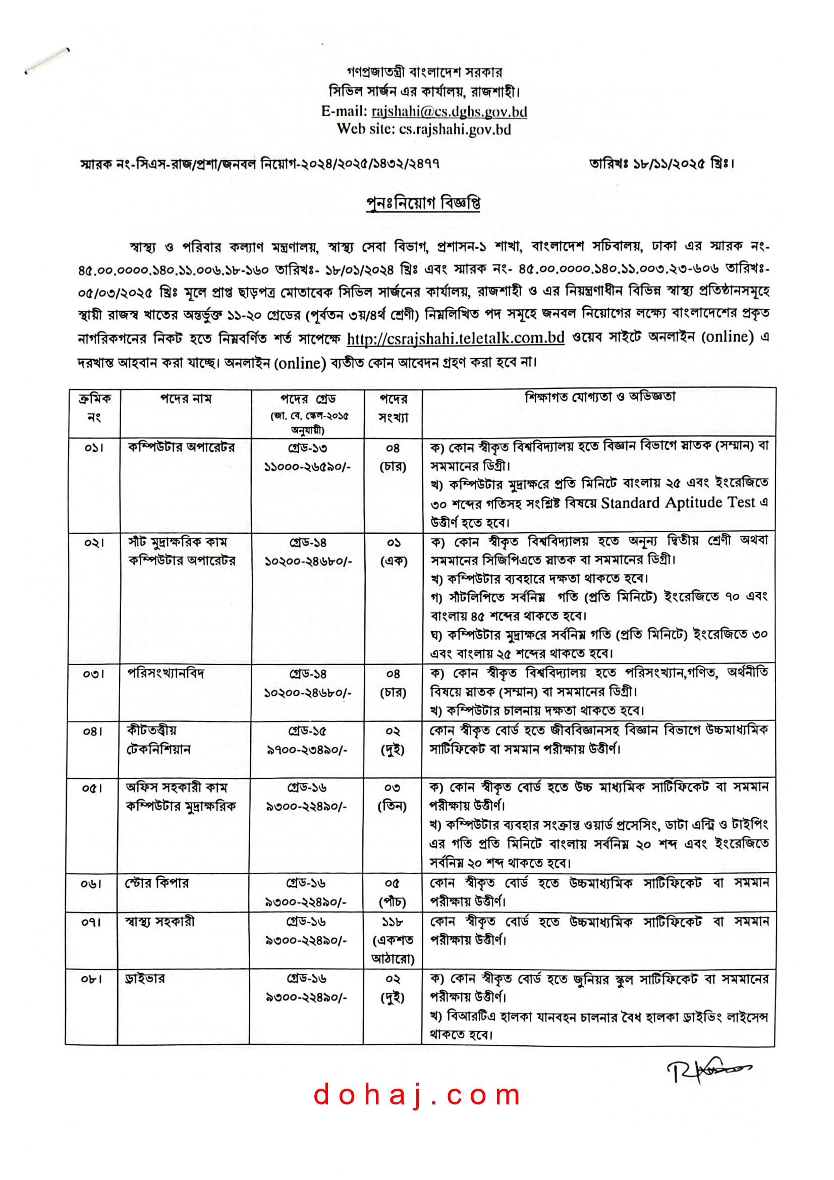 শিক্ষাগত যোগ্যতা: জুনিয়র স্কুল সার্টিফিকেট বা সমমানের পরীক্ষায় উত্তীর্ণ।