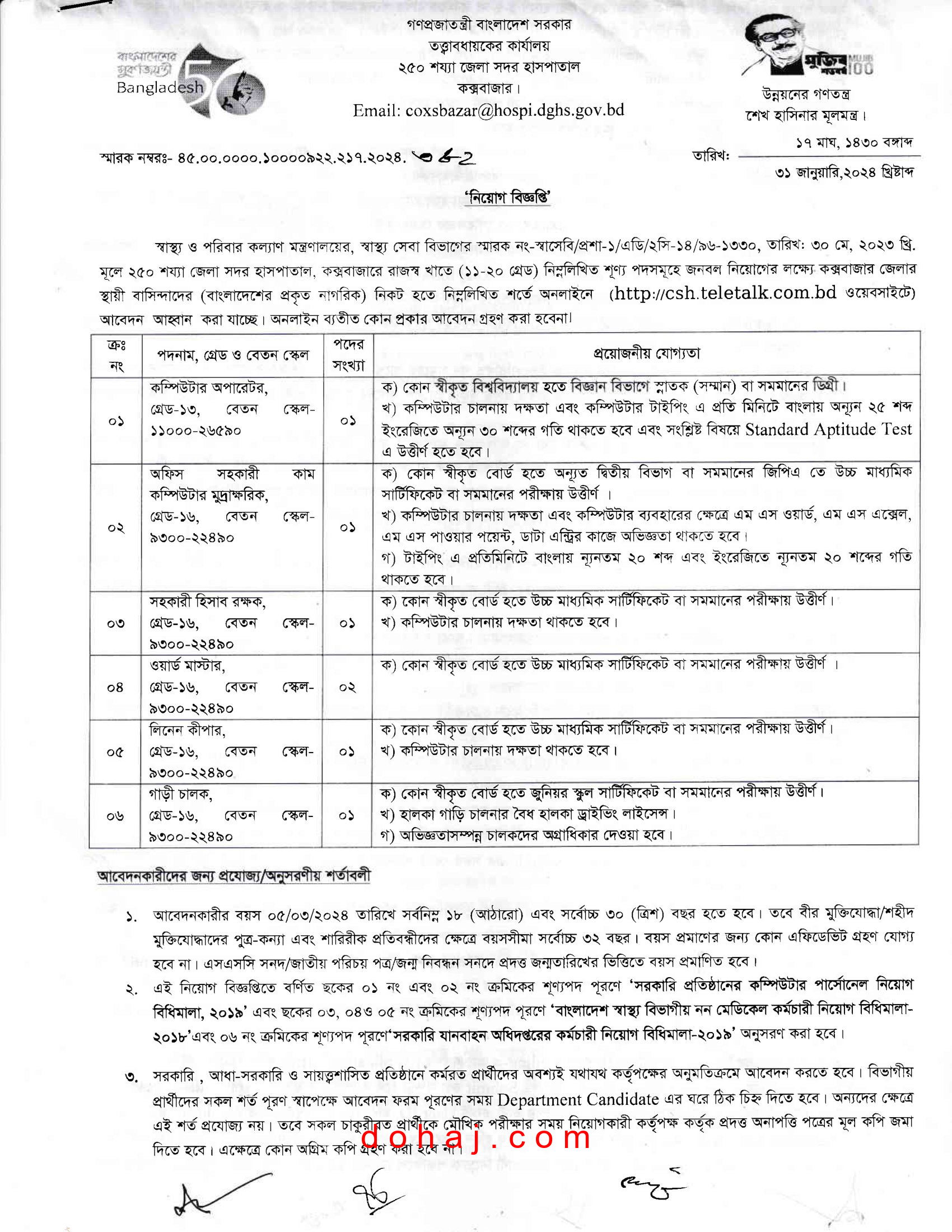 District Sadar Hospital Coxsbazar Job Circular: কক্সবাজার জেলা সদর হাসপাতালের শূন্য পদসমুহে জনবল নিয়োগ দেয়া হবে। কক্সবাজার জেলা সদর হাসপাতাল ০৬ টি পদে মোট ০৭ জনকে নিয়োগ দেয়া হবে। পদগুলোতে নারী ও পুরুষ উভয়েই আবেদন করতে পারবেন। আগ্রহী প্রার্থীরা অনলাইনে আবেদন করতে পারবেন। এই চাকরিতে সকল জেলার আগ্রহী প্রার্থীরা আবেদন করতে পারবেন। আগ্রহ ও যোগ্যতা থাকলে আপনিও আবেদন করতে পারেন। সম্পূর্ণ বিজ্ঞপ্তি বিস্তারিত দেওয়া হল।