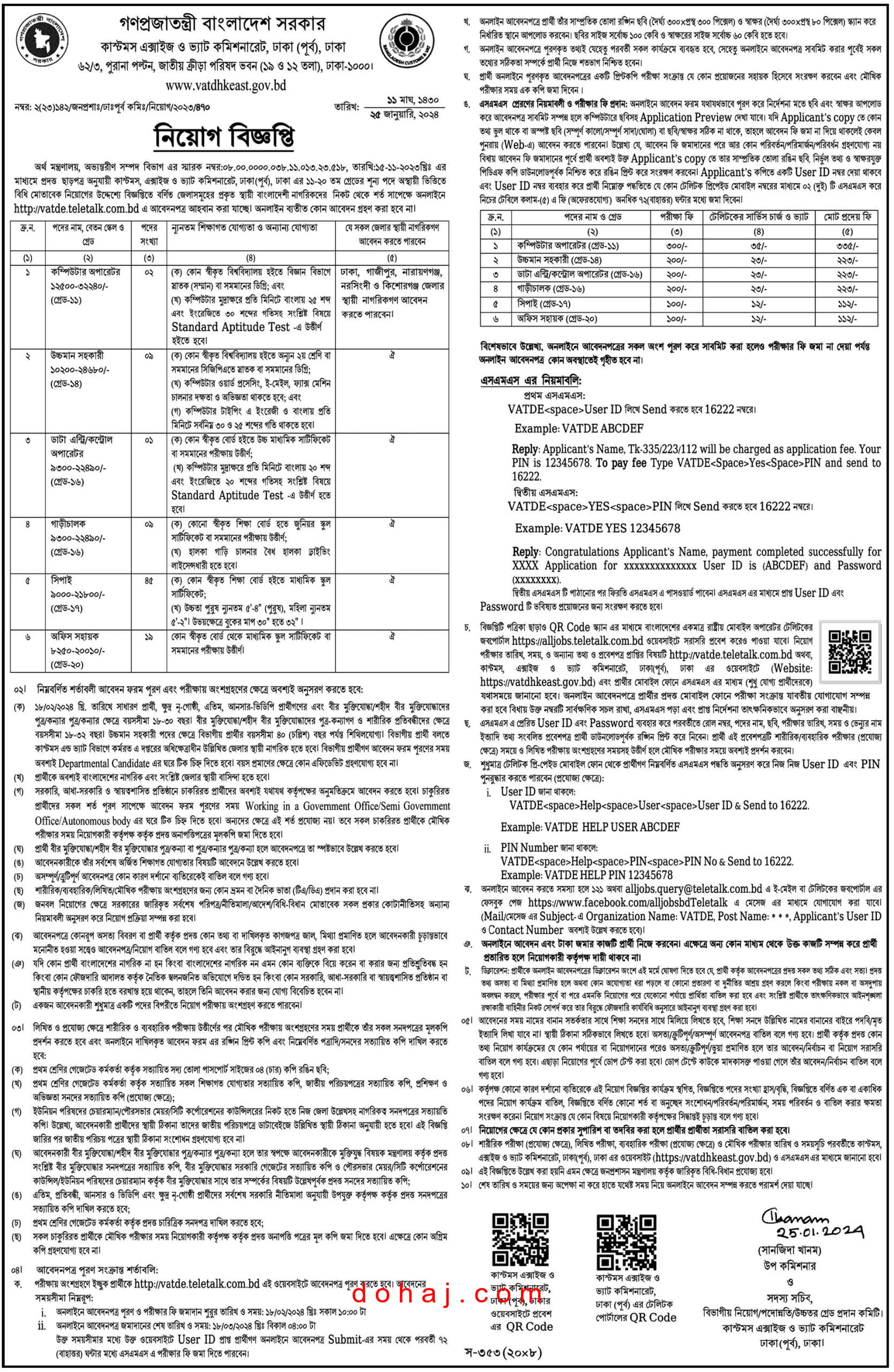 VAT Dhaka East Job Circular: কাস্টমস, এক্সাইজ ও ভ্যাট কমিশনারেট, ঢাকা (পূর্ব) এর শূন্য পদসমূহে জনবল নিয়োগ দেয়া হবে। কাস্টমস, এক্সাইজ ও ভ্যাট কমিশনারেট, ঢাকা (পূর্ব) ০৬ টি পদে মোট ৮৫ জনকে নিয়োগ দেবে। উক্ত পদে নারী-পুরুষ উভয়ই আবেদন করতে পারবেন। আগ্রহী প্রার্থীরা অনলাইনে আবেদন করতে পারবেন। আগ্রহ ও যোগ্যতা থাকলে আপনিও আবেদন করতে পারেন। আবেদন প্রক্রিয়াসহ সম্পূর্ণ বিজ্ঞপ্তি বিস্তারিত দেওয়া হল: