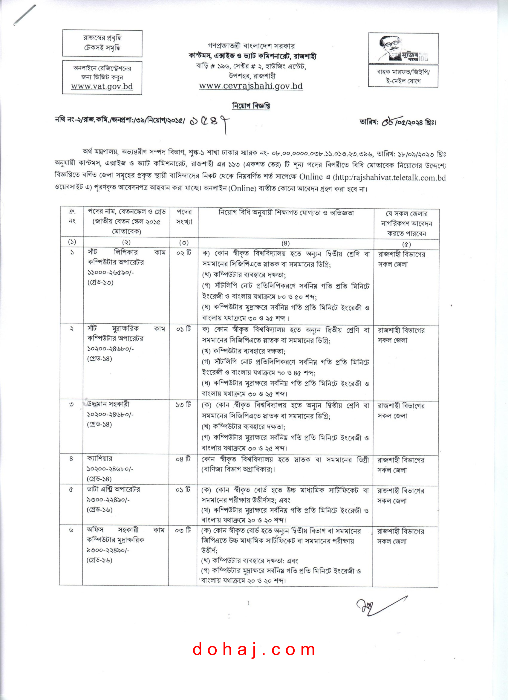 Customs, Excise & VAT Commissionerate, Rajshahi Job Circular: কাস্টমস, এক্সাইজ ও ভ্যাট কমিশনারেট, রাজশাহী এর শূন্য পদসমূহে জনবল নিয়োগ দেয়া হবে। কাস্টমস, এক্সাইজ ও ভ্যাট কমিশনারেট, রাজশাহী ১১ টি পদে মোট ১১৩ জনকে নিয়োগ দেবে। উক্ত পদে নারী-পুরুষ উভয়ই আবেদন করতে পারবেন। আগ্রহী প্রার্থীরা অনলাইনে আবেদন করতে পারবেন। আগ্রহ ও যোগ্যতা থাকলে আপনিও আবেদন করতে পারেন। আবেদন প্রক্রিয়াসহ সম্পূর্ণ বিজ্ঞপ্তি বিস্তারিত দেওয়া হল: