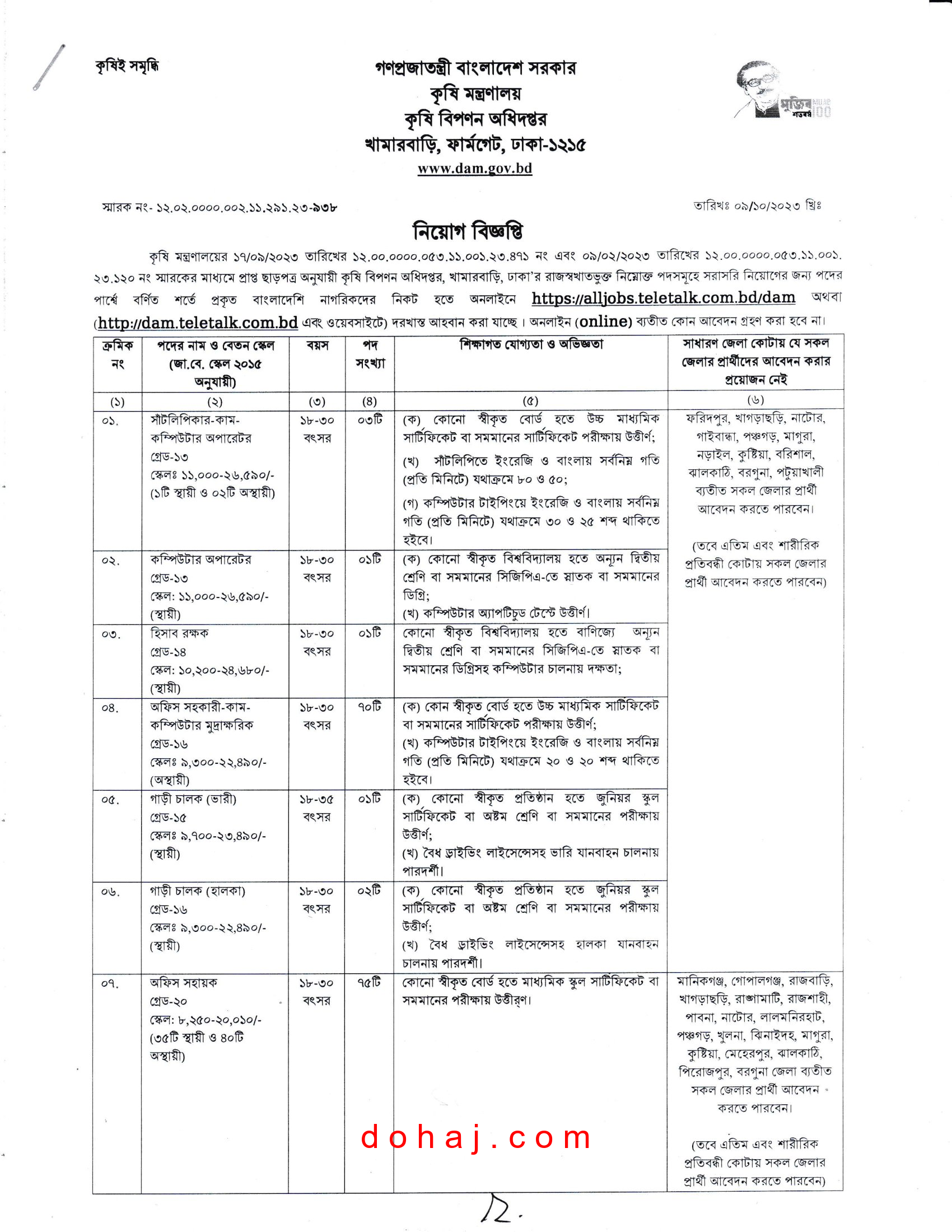 DAM Job Circular 2023: কৃষি মন্ত্রণালয়ের কৃষি বিপণন অধিদপ্তর এর শূন্য পদসমূহে জনবল নিয়োগ দেয়া হবে। কৃষি বিপণন অধিদপ্তর ০৭ টি পদে মোট ১৫৩ জনকে নিয়োগ দেবে। পদগুলোতে নারী ও পুরুষ উভয়েই আবেদন করতে পারবেন। আগ্রহী প্রার্থীরা অনলাইনে আবেদন করতে পারবেন। আগ্রহ ও যোগ্যতা থাকলে আপনিও আবেদন করতে পারেন। সম্পূর্ণ বিজ্ঞপ্তি বিস্তারিত দেওয়া হল।