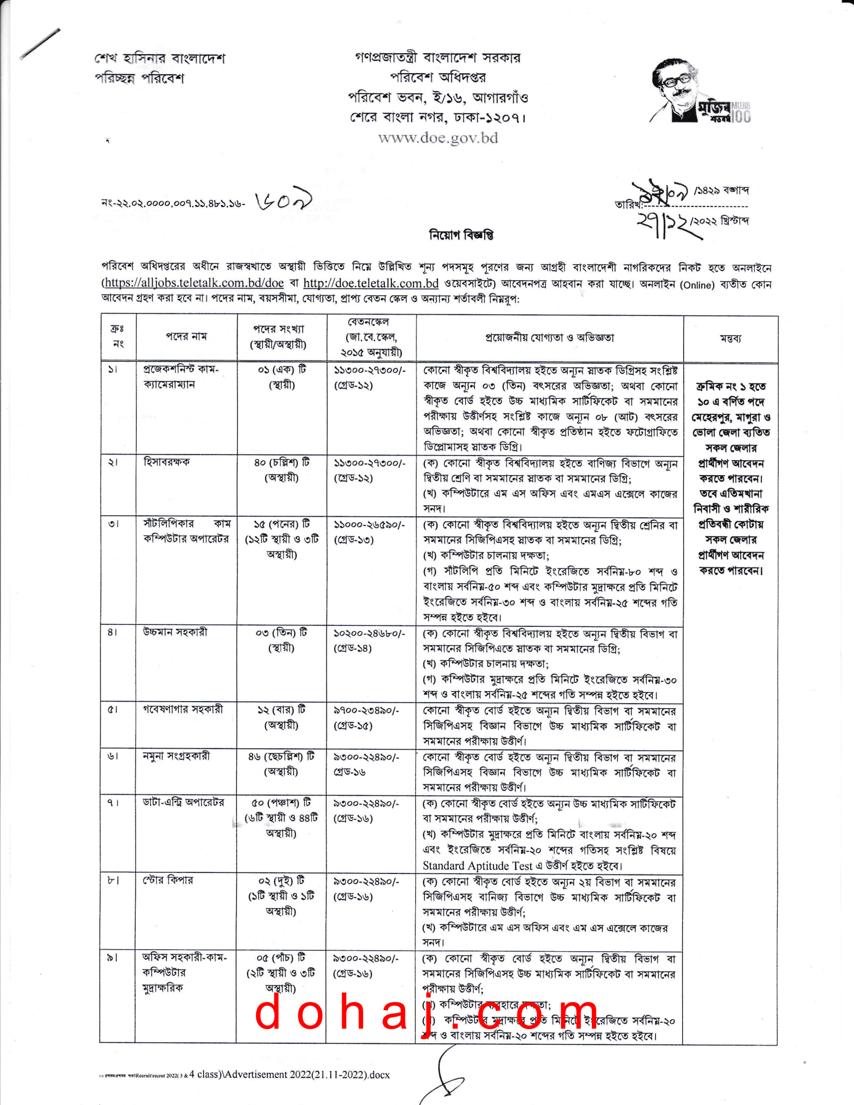 পরিবেশ অধিদপ্তরের শূন্য পদসমুহ পূরণের জন্য জনবল নিয়োগের বিজ্ঞপ্তি প্রকাশ করেছে পরিবেশ অধিদপ্তর। পরিবেশ অধিদপ্তর ১৩ টি পদে মোট ২৭৫ জনকে নিয়োগ দেবে। পদগুলোতে সকল জেলার এবং সকল কৌটার প্রার্থীগন আবেদন করতে পারবেন। আগ্রহী প্রার্থীরা অনলাইনে আবেদন করতে পারবেন। আগ্রহ ও যোগ্যতা থাকলে আপনিও আবেদন করতে পারেন। সম্পূর্ণ বিজ্ঞপ্তি বিস্তারিত দেওয়া হল।