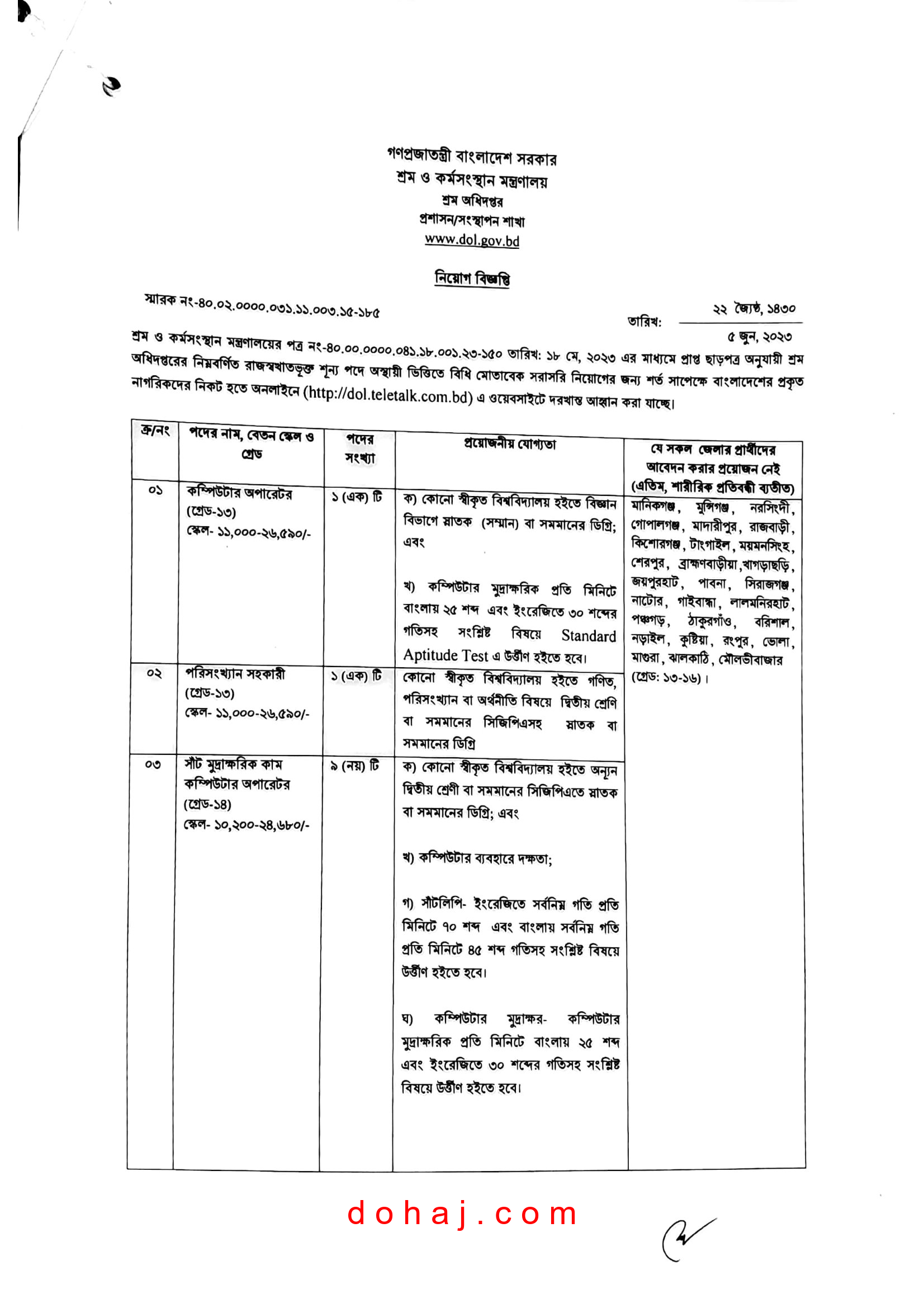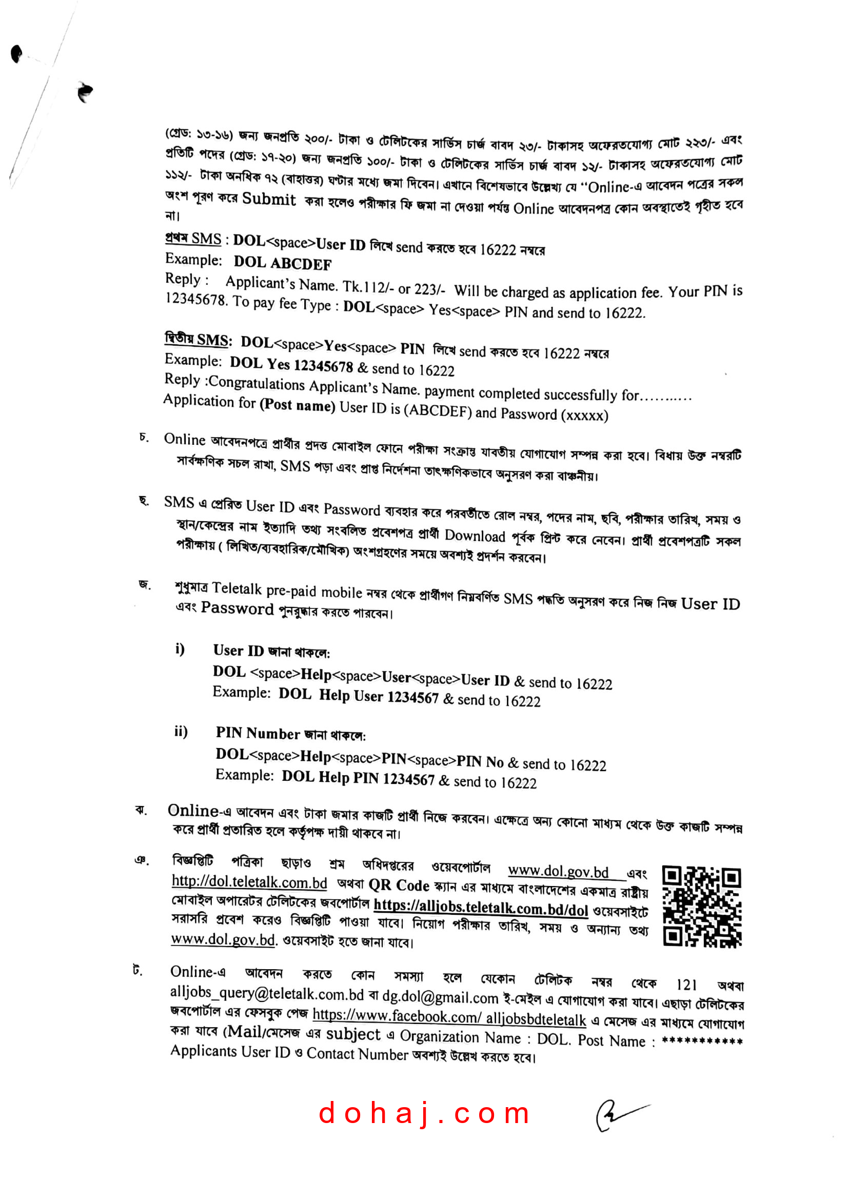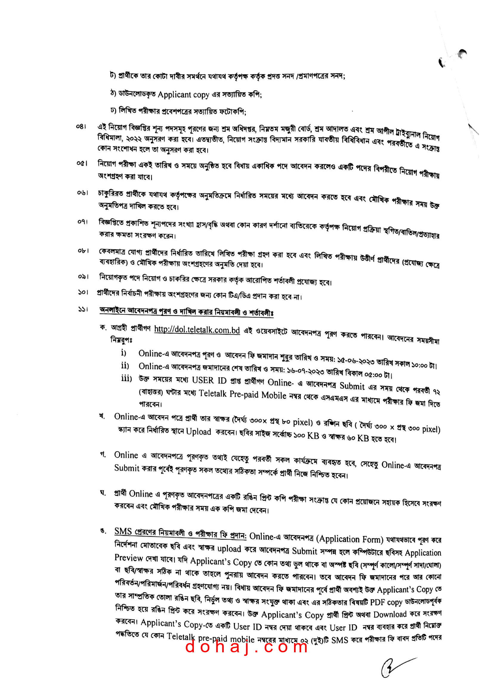 আবেদন প্রক্রিয়া: আগ্রহী প্রার্থীরা অনলাইনে http://dol.teletalk.com.bd এই ওয়েবসাইটে গিয়ে আবেদনপত্র পূরণ করতে পারবেন।