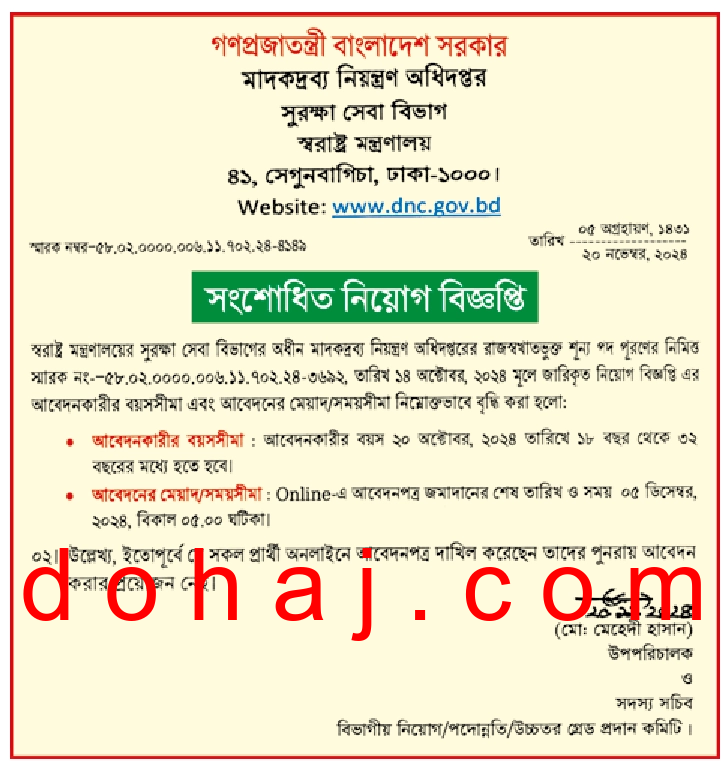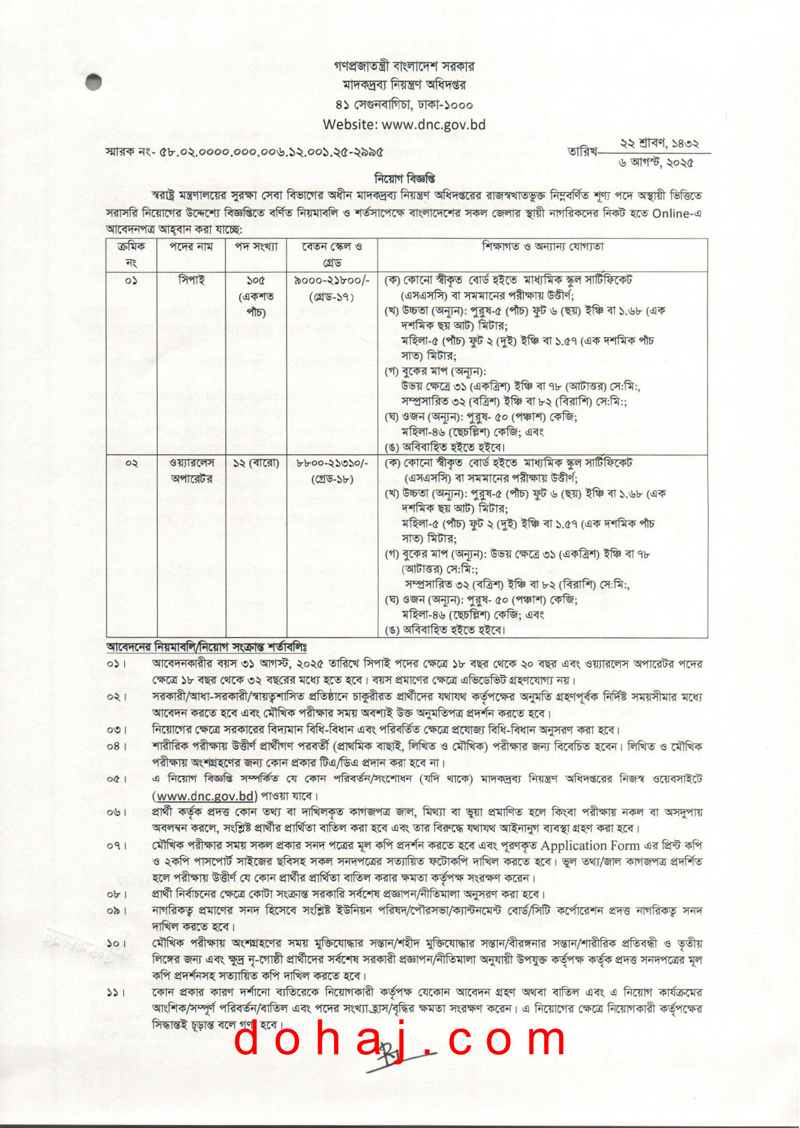 DNC Job Circular 2025: স্বরাষ্ট্র মন্ত্রণালয়ের সুরক্ষা সেবা বিভাগের অধীন মাদকদ্রব্য নিয়ন্ত্রণ অধিদপ্তরের শূণ্য পদসমূহে সরাসরি জনবল নিয়োগের বিজ্ঞপ্তি প্রকাশ হয়েছে। মাদকদ্রব্য নিয়ন্ত্রণ অধিদপ্তর ০২ টি পদে মোট ১১৭ জনকে নিয়োগ দেবে। পদগুলোতে নারী-পুরুষ উভয়ই প্রার্থীরা আবেদন করতে পারবেন। আগ্রহী প্রার্থীরা অনলাইনে আবেদন করতে পারবেন। আগ্রহ ও যোগ্যতা থাকলে আপনিও আবেদন করতে পারেন। সম্পূর্ণ বিজ্ঞপ্তি বিস্তারিত দেওয়া হল।