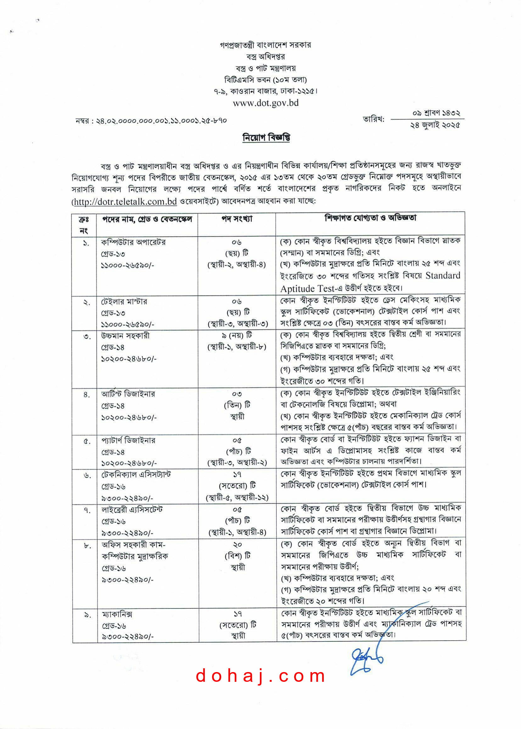 DOT Job Circular 2025: বস্ত্র ও পাট মন্ত্রণালয়াধীন বস্ত্র অধিদপ্তর শূন্য পদসমূহে জনবল নিয়োগের বিজ্ঞপ্তি প্রকাশ করেছে। বস্ত্র অধিদপ্তর স্থায়ী এবং অস্থায়ী ভাবে ১৮ টি পদে মোট ১৯০ জনকে নিয়োগ দেবে। পদগুলোতে নারী ও পুরুষ উভয়ই প্রার্থীরা আবেদন করতে পারবেন। আগ্রহী প্রার্থীরা অনলাইনে আবেদন করতে পারবেন। আগ্রহ ও যোগ্যতা থাকলে আপনিও আবেদন করতে পারেন। সম্পূর্ণ বিজ্ঞপ্তি বিস্তারিত দেওয়া হল।