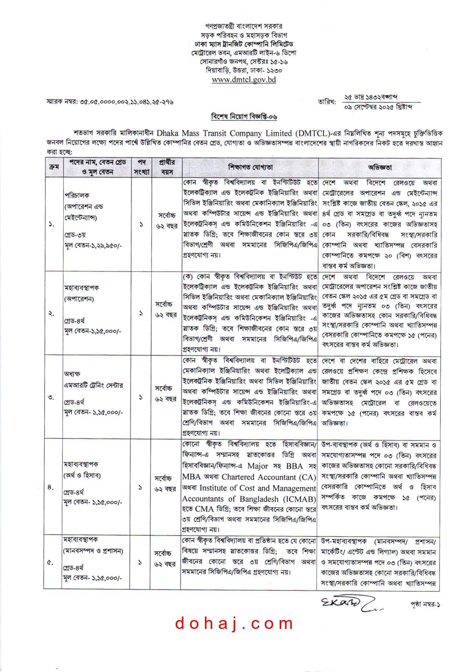 আবেদনের প্রক্রিয়া: আবেদনপত্র আগামী ১৬.১০.২০২৫ তারিখের মধ্যে অফিস চলাকালীন সময়ে কেবলমাত্র ডাকযোগে বা কুরিয়ার সার্ভিসে ব্যবস্থাপনা পরিচালক, ঢাকা ম্যাস ট্রানজিট কোম্পানি লিমিটেড, মেট্রোরেল ভবন, এমআরটি লাইন-৬ ডিপো, সোনারগাঁও জনপথ, সেক্টরঃ ১৫-১৬ দিয়াবাড়ি, উত্তরা, ঢাকা- ১২৩০-এর বরাবরে পৌঁছাতে হবে।