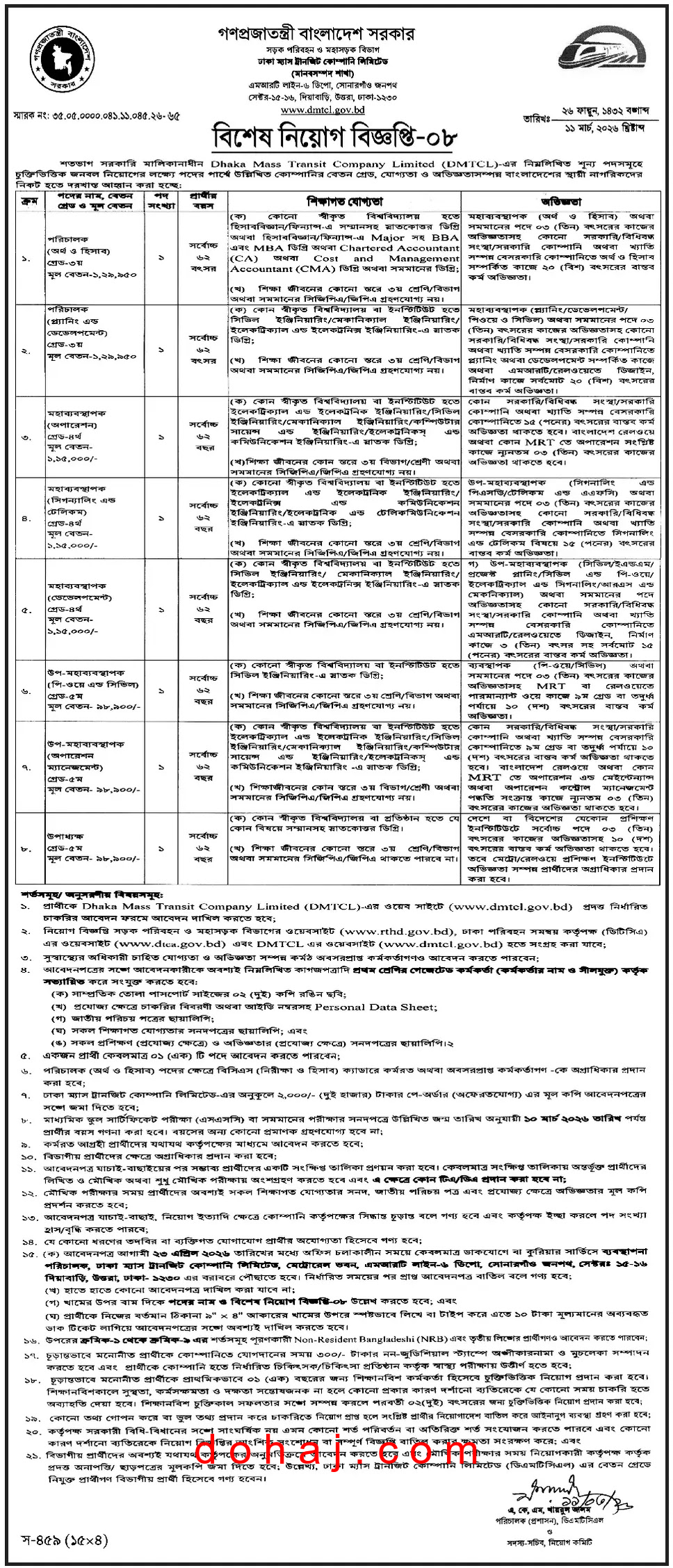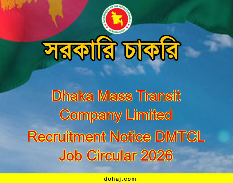 DMTCL Job Circular 2026: ঢাকা ম্যাস ট্রানজিস্ট কোম্পানি লিমিটেড শূন্য পদসমূহে জনবল নিয়োগের নতুন নিয়োগ বিজ্ঞপ্তি প্রকাশ হয়েছে। ঢাকা ম্যাস ট্রানজিস্ট কোম্পানি লিমিটেড ০৮ টি পদে মোট ০৮ জনকে নিয়োগ দেবে। নারী ও পুরুষ উভয়কেই নিয়োগ দেওয়া হবে। আগ্রহী প্রার্থীরা ডাকযোগে আবেদন করতে পারবেন। আগ্রহ ও যোগ্যতা থাকলে আপনিও আবেদন করতে পারেন। সম্পূর্ণ বিজ্ঞপ্তি বিস্তারিত দেওয়া হল।