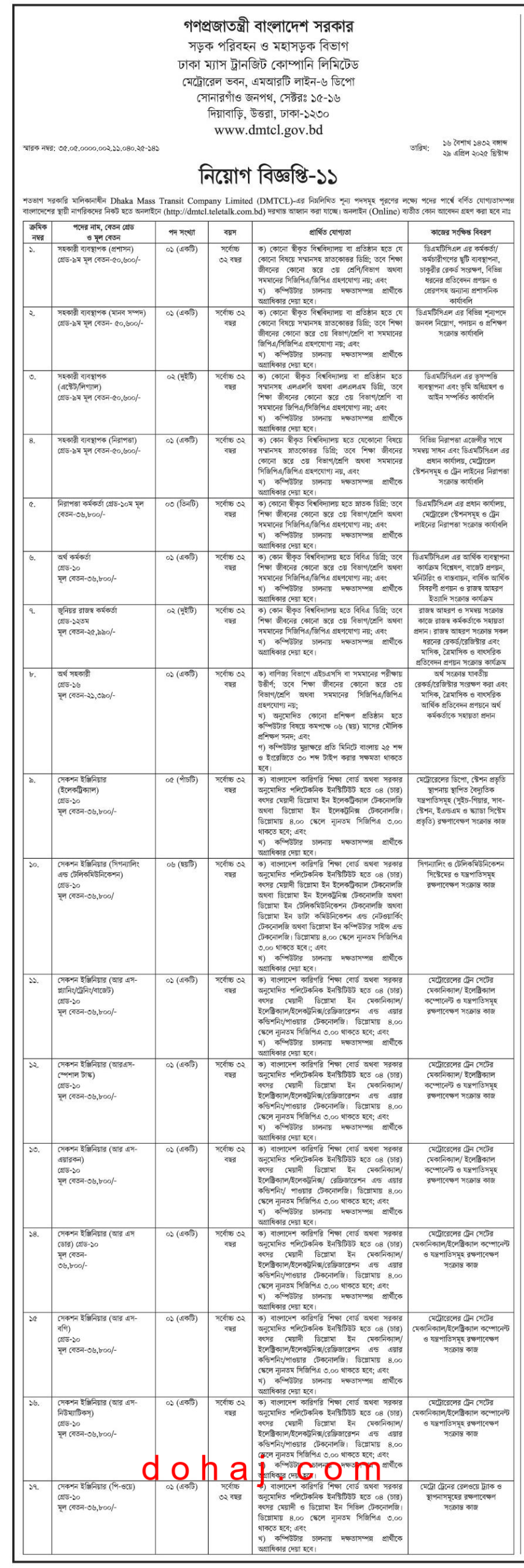 DMTCL Job Circular: সড়ক পরিবহন ও মহাসড়ক বিভাগ ঢাকা ম্যাস ট্রানজিট কোম্পানি লিমিটেড শূন্য পদসমূহে জনবল নিয়োগের জন্য নিয়োগ বিজ্ঞপ্তি প্রকাশ করেছে। ঢাকা ম্যাস ট্রানজিট কোম্পানি লিমিটেড ২৪ টি পদে মোট ১২০ জনকে নিয়োগ দেবে। আগ্রহী প্রার্থীরা অনলাইনে আবেদন করতে পারবেন। উক্ত পদে নারী-পুরুষ উভয়ই আবেদন করতে পারবেন। আগ্রহ ও যোগ্যতা থাকলে আপনিও আবেদন করতে পারেন। আবেদন প্রক্রিয়াসহ সম্পূর্ণ বিজ্ঞপ্তি বিস্তারিত দেওয়া হল।