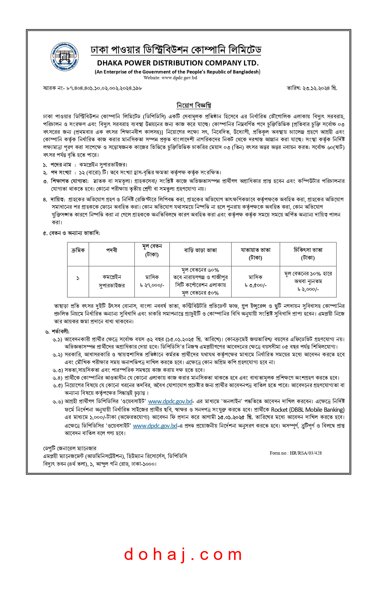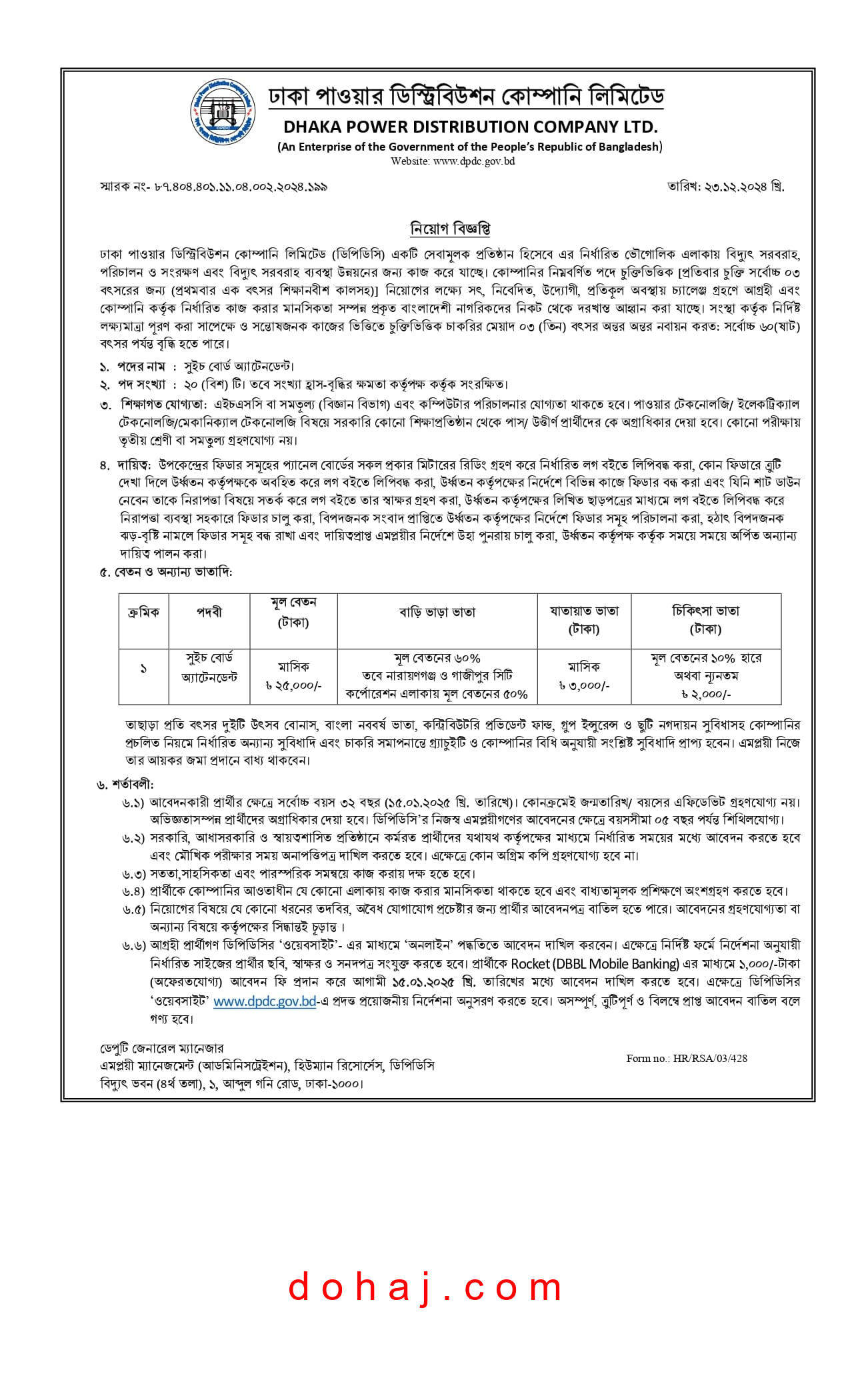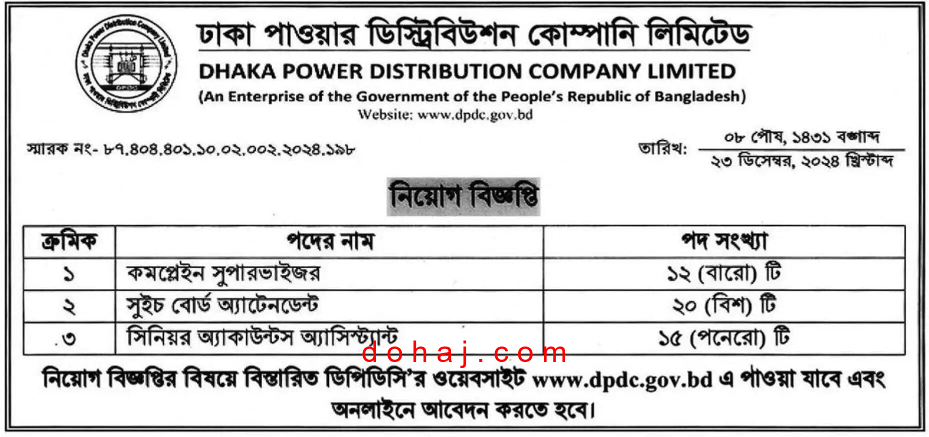 Dhaka Power Distribution Company (DPDC) Job Circular: ঢাকা পাওয়ার ডিস্ট্রিবিউশন কোম্পানি লিমিটেড (ডিপিডিসি) এর শূন্য পদসমূহে জনবল নিয়োগ দেয়া হবে। ঢাকা পাওয়ার ডিস্ট্রিবিউশন কোম্পানি লিমিটেড ০৩ টি পদে মোট ৪৭ জনকে নিয়োগ দেবে। আগ্রহী প্রার্থীরা অনলাইনে আবেদন করতে পারবেন। এই চাকরিতে সকল জেলার প্রার্থীরা আবেদন করার সুযোগ আছে। আগ্রহ ও যোগ্যতা থাকলে আপনিও আবেদন করতে পারেন। সম্পূর্ণ বিজ্ঞপ্তি (DPDC Job Circular 2025) বিস্তারিত দেওয়া হল।