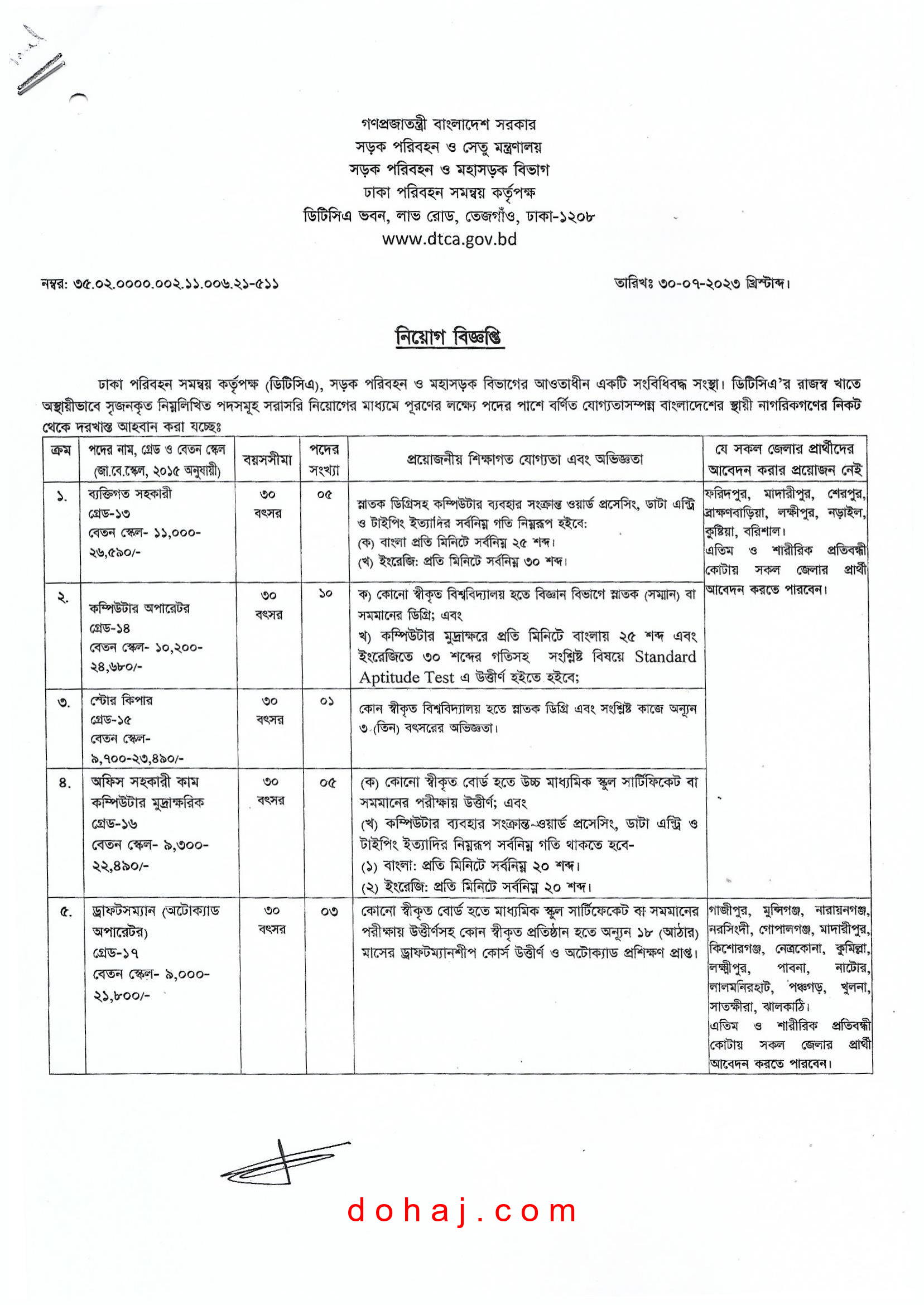 DTCA JOB CIRCULAR 2023: সড়ক পরিবহন ও সেতু মন্ত্রণালয়ের অধীনস্থ ঢাকা পরিবহন সমন্বয় কর্তৃপক্ষ (ডিটিসিএ) বিভিন্ন পদে সরকারি বিধি মোতাবেক জনবল নিয়োগ দেবে। ঢাকা পরিবহন সমন্বয় কর্তৃপক্ষ ০৫ টি পদে মোট ২৪ জনকে নিয়োগ দেবে। আগ্রহ ও যোগ্যতা থাকলে আপনিও আবেদন করতে পারেন। আগ্রহী প্রার্থীরা অনলাইনে আবেদন করতে পারবেন। সম্পূর্ণ বিজ্ঞপ্তি দেওয়া হল-