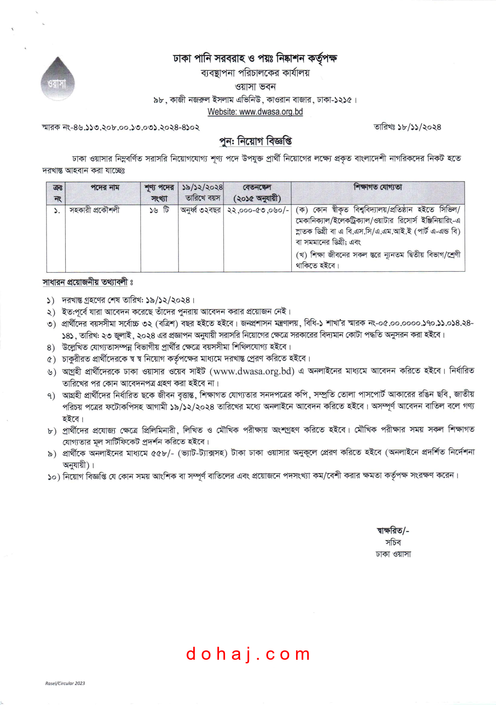 আবেদনের শেষ সময়: আগামী ১৯ ডিসেম্বর ২০২৪ তারিখের মধ্যে অনলাইনে আবেদন করতে হবে।