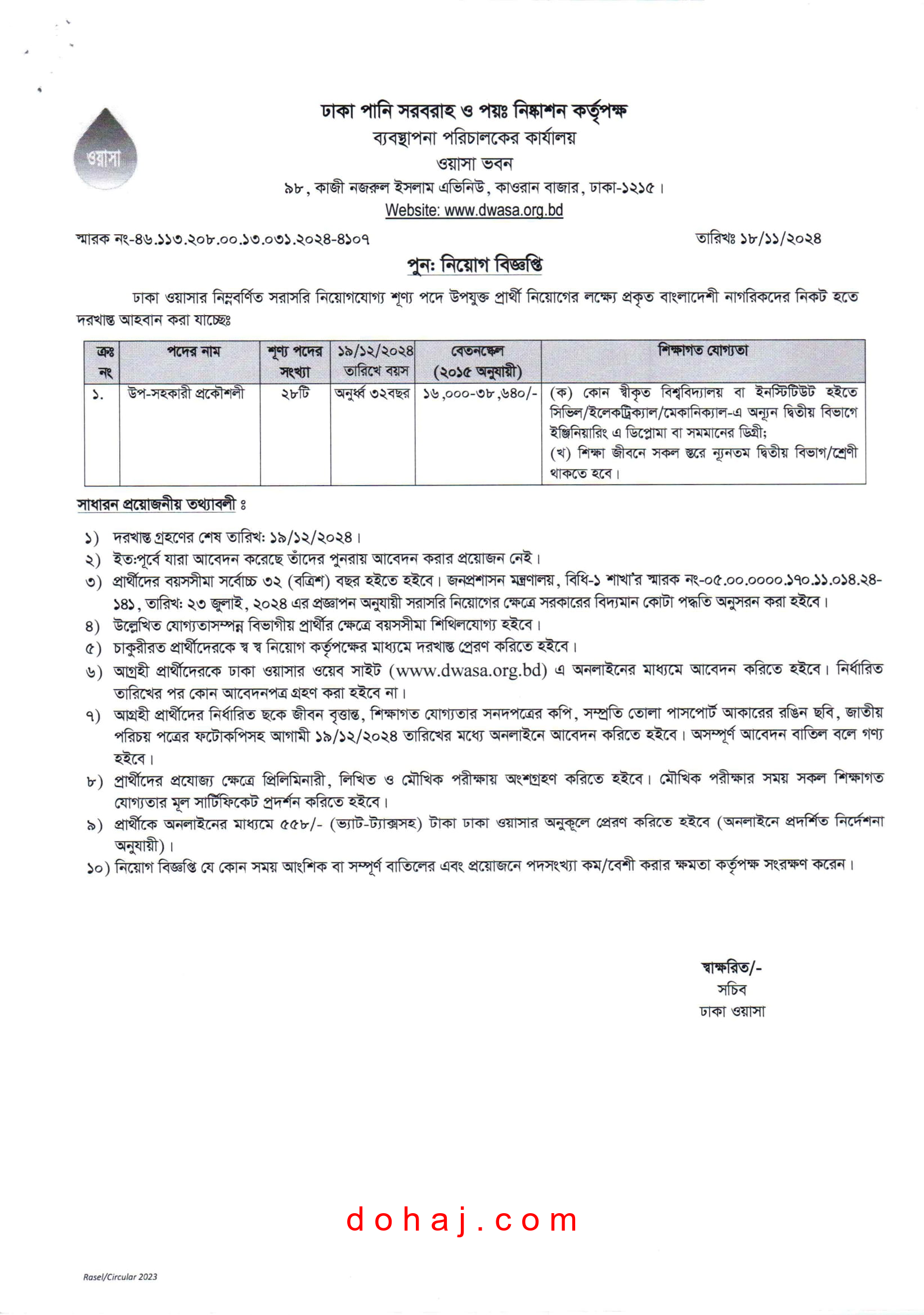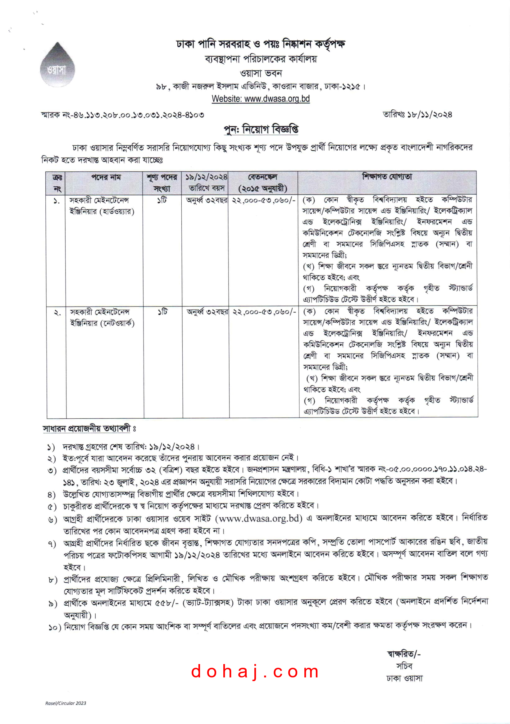 আবেদন প্রক্রিয়া: আগ্রহী প্রার্থীদেরকে ঢাকা ওয়াসার ওয়েব সাইট https://erecruitmentdwasa.org/এ অনলাইনের মাধ্যমে আবেদন করতে হবে।