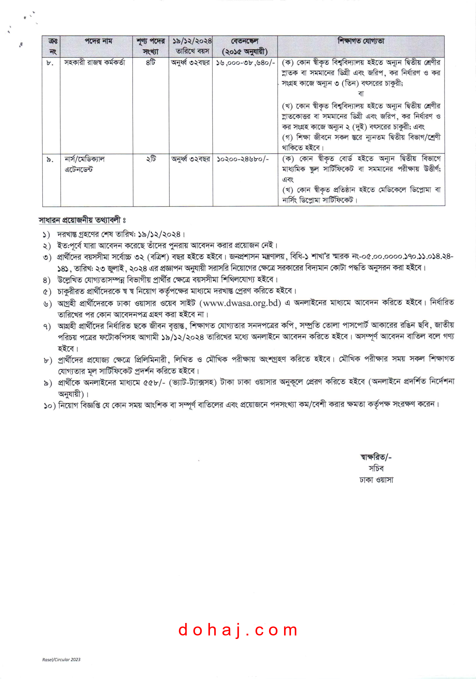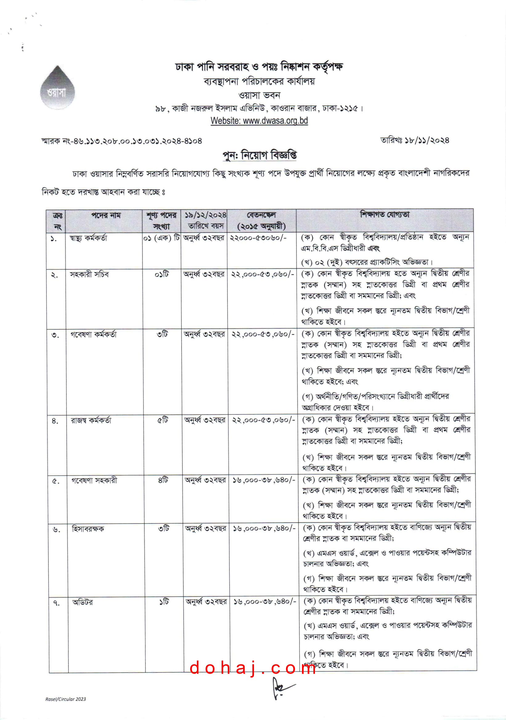 DWASA job circular 2024: ঢাকা পানি সরবরাহ ও পয়: নিষ্কাশন কর্তৃপক্ষ (ঢাকা ওয়াসার) শূন্য পদসমূহে জনবল নিয়োগ দেয়া হবে। ঢাকা ওয়াসা ১৩ টি পদে মোট ৭০ জনকে নিয়োগ দেবে। উক্ত পদ গুলোতে নারী- পুরুষ উভয়ই আবেদন করতে পারবেন। আগ্রহী প্রার্থীরা অনলাইনে আবেদন করতে পারবেন। এই চাকরিতে সকল জেলার প্রার্থীদের আবেদন করার সুযোগ আছে। সম্পূর্ণ বিজ্ঞপ্তি (dhaka wasa job circular 2024) বিস্তারিত দেওয়া হল।