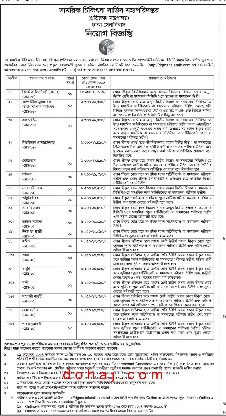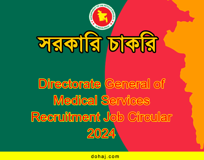 DGMS Job circular 2024: সামরিক চিকিৎসা সার্ভিস মহাপরিদপ্তর (প্রতিরক্ষা মন্ত্রণালয়), ঢাকা সেনানিবাস এবং ইহার আওতাধীন আন্তঃবাহিনী মেডিকেল ইউনিট সমূহের শূন্য পদে বেসামরিক লোক নিয়োগ দেয়া হবে। সামরিক চিকিৎসা সার্ভিস মহাপরিদপ্তর ১৮ টি পদে মোট ৩৯ জনকে নিয়োগ দেবে। আগ্রহী প্রার্থীরা অনলাইনে আবেদন করতে পারবেন। উক্ত পদ গুলোতে নারী- পুরুষ উভয়ই আবেদন করতে পারবেন। আগ্রহ ও যোগ্যতা থাকলে আপনিও আবেদন করতে পারেন। সম্পূর্ণ বিজ্ঞপ্তি (DGMS Job circular 2024) বিস্তারিত দেওয়া হল।